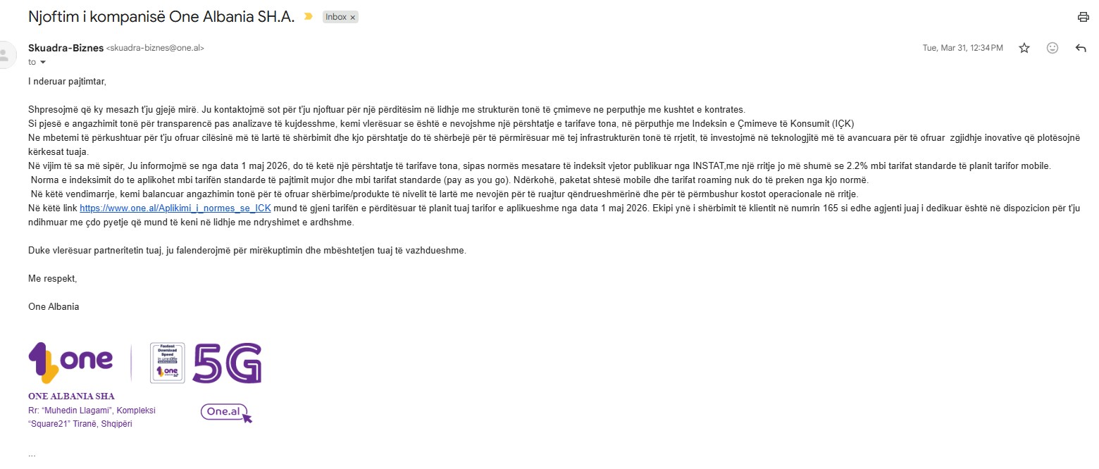 Në faksimile është njoftimi online i ONE për pajtimtarët.