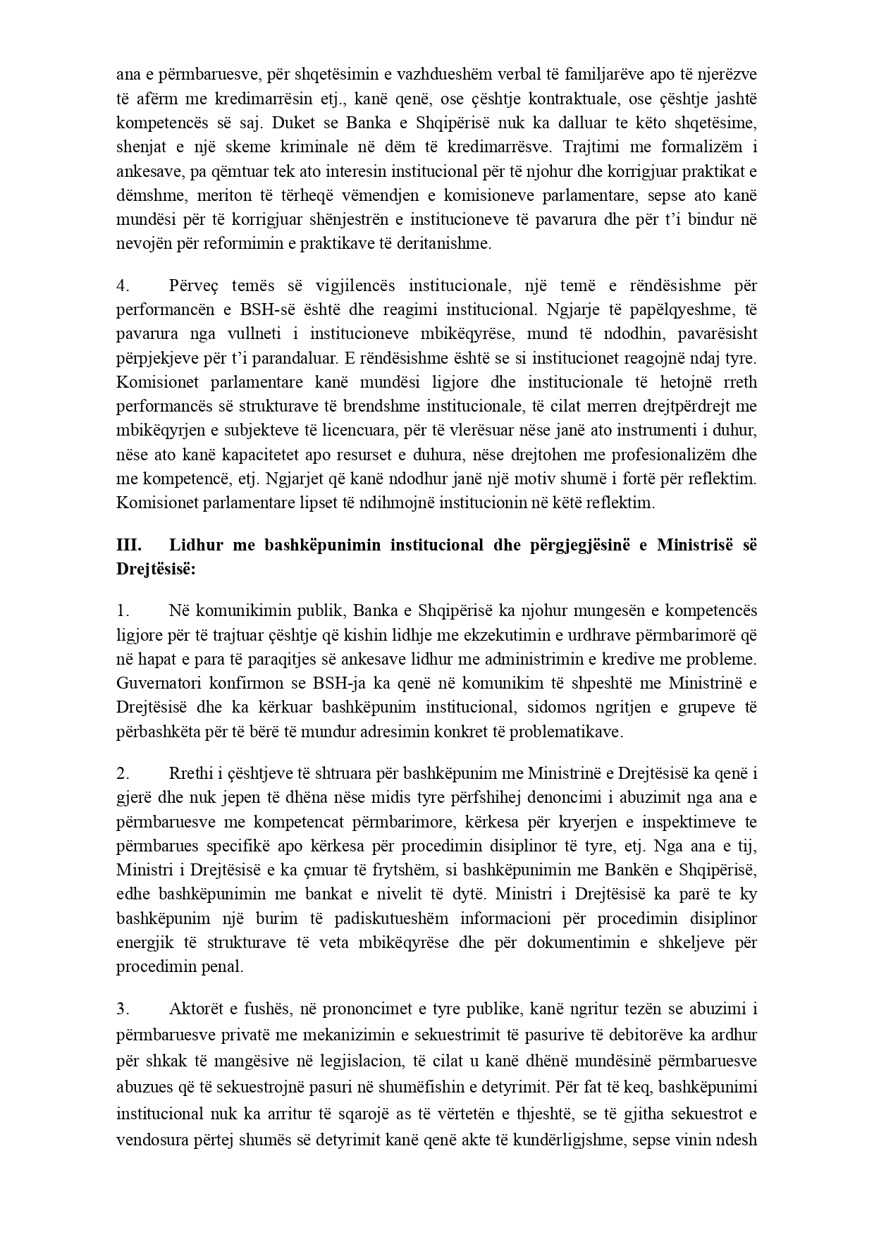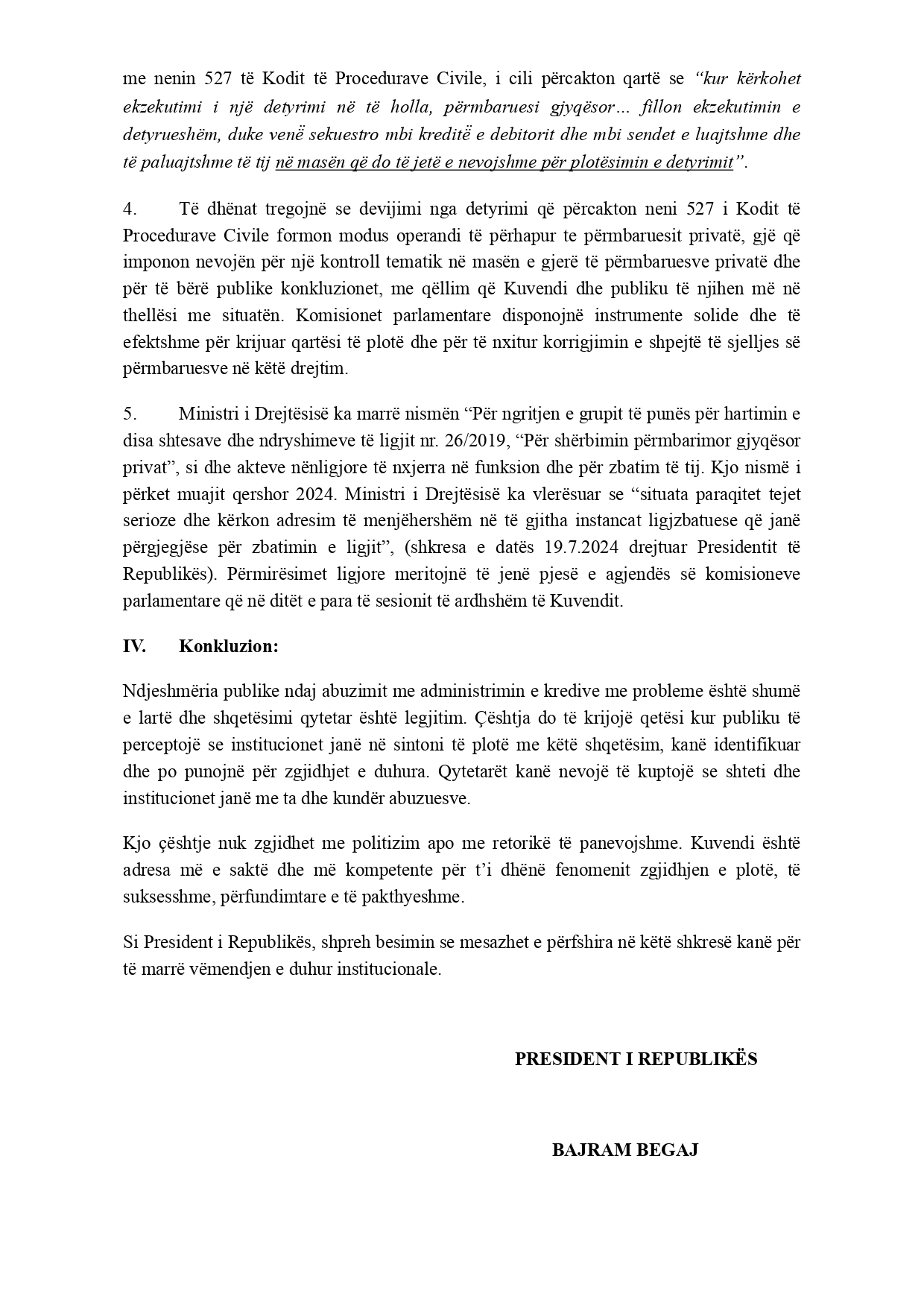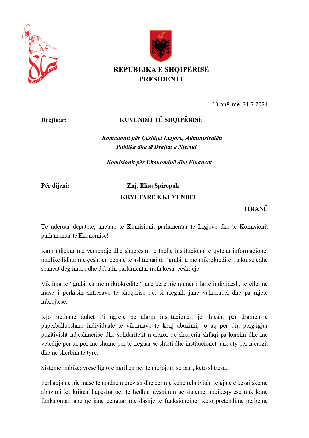 ”Ndjeshmëria publike ndaj abuzimit me administrimin e kredive me probleme është shumë e lartë dhe shqetësimi qytetar është legjitim. Çështja do të krijojë qetësi kur publiku të perceptojë se institucionet janë në sintoni të plotë me këtë shqetësim, kanë identifikuar dhe po punojnë për zgjidhjet e duhura. Qytetarët kanë nevojë të kuptojë se shteti dhe institucionet janë me ta dhe kundër abuzuesve. Kjo çështje nuk zgjidhet me politizim apo me retorikë të panevojshme. Kuvendi është adresa më e saktë dhe më kompetente për t’i dhënë fenomenit zgjidhjen e plotë, të suksesshme, përfundimtare e të pakthyeshme. Si President i Republikës, shpreh besimin se mesazhet e përfshira në këtë shkresë kanë për të marrë vëmendjen e duhur institucionale”.