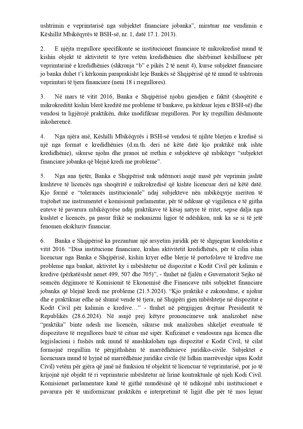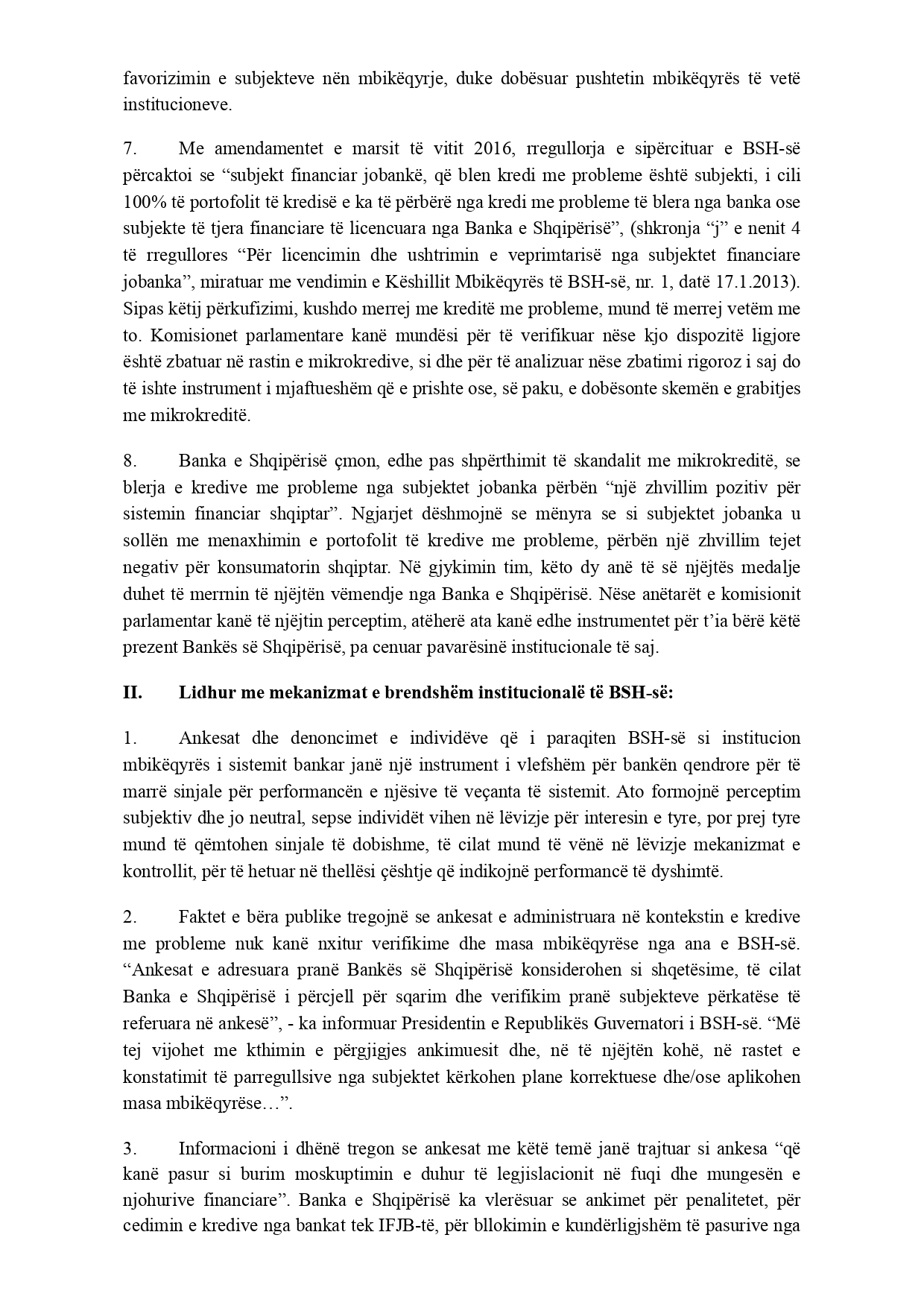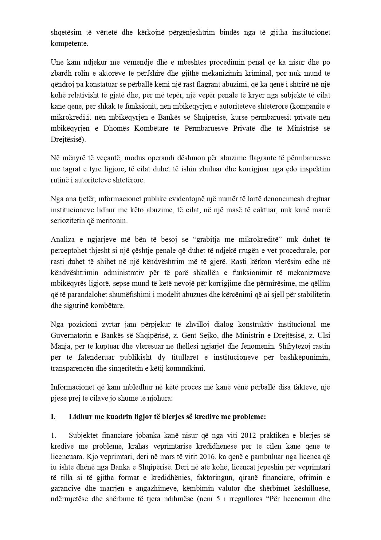 “Sistemet mbikëqyrëse ligjore ngrihen për të mbrojtur, së pari, këto shtresa. Përhapja në një masë të madhe njerëzish dhe për një kohë relativisht të gjatë e kësaj skeme abuzimi ka krijuar hapësira për të hedhur dyshimin se sistemet mbikëqyrëse nuk kanë funksionuar apo që janë penguar me dashje të funksionojnë. Këto pretendime përbëjnë shqetësim të vërtetë dhe kërkojnë përgënjeshtrim bindës nga të gjitha institucionet kompetente. Unë kam ndjekur me vëmendje dhe e mbështes procedimin penal që ka nisur dhe po zbardh rolin e aktorëve të përfshirë dhe gjithë mekanizimin kriminal, por nuk mund të qëndroj pa konstatuar se përballë kemi një rast flagrant abuzimi, që ka qenë i shtrirë në një kohë relativisht të gjatë dhe, për më tepër, një vepër penale të kryer nga subjekte të cilat kanë qenë, për shkak të funksionit, nën mbikëqyrjen e autoriteteve shtetërore (kompanitë e mikrokreditit nën mbikëqyrjen e Bankës së Shqipërisë, kurse përmbaruesit privatë nën mbikëqyrjen e Dhomës Kombëtare të Përmbaruesve Privatë dhe të Ministrisë së Drejtësisë)”.