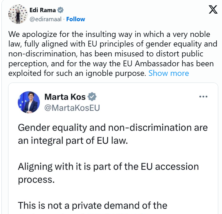 Rama u shpreh se “kërkon ndjesë për mënyrën fyese se si një ligj shumë fisnik, plotësisht në përputhje me parimet e BE-së për barazinë gjinore dhe mosdiskriminimin, është keqpërdorur për të shtrembëruar perceptimin publik, si dhe për mënyrën se si Ambasadori i BE-së është shfrytëzuar për një qëllim kaq të ulët”.