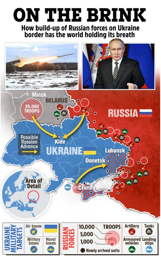 Britanika “The Sun” ka publikuar një hartë ku tregon se si Ukraina është rrethuar nga të gjitha drejtimet nga forcat ushtarake ruse. Nëse Putin do të urdhërojë, 35 mijë trupa mund të mbërrijnë menjëherë në Kiev nga Bjellorusia, ndërkohë që një kontingjent tjetër mund të mbërrijë nga kufiri me Rusinë.