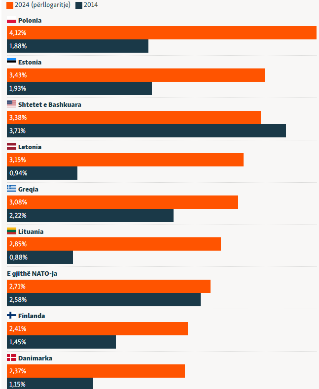 Në vitin 2024, 23 vende anëtare të NATO-s pritet ta kenë përmbushur ose tejkaluar objektivin për të investuar së paku 2 për qind të prodhimit të brendshëm bruto në mbrojtje, krahasuar me vetëm tri vende anëtare në vitin 2014.