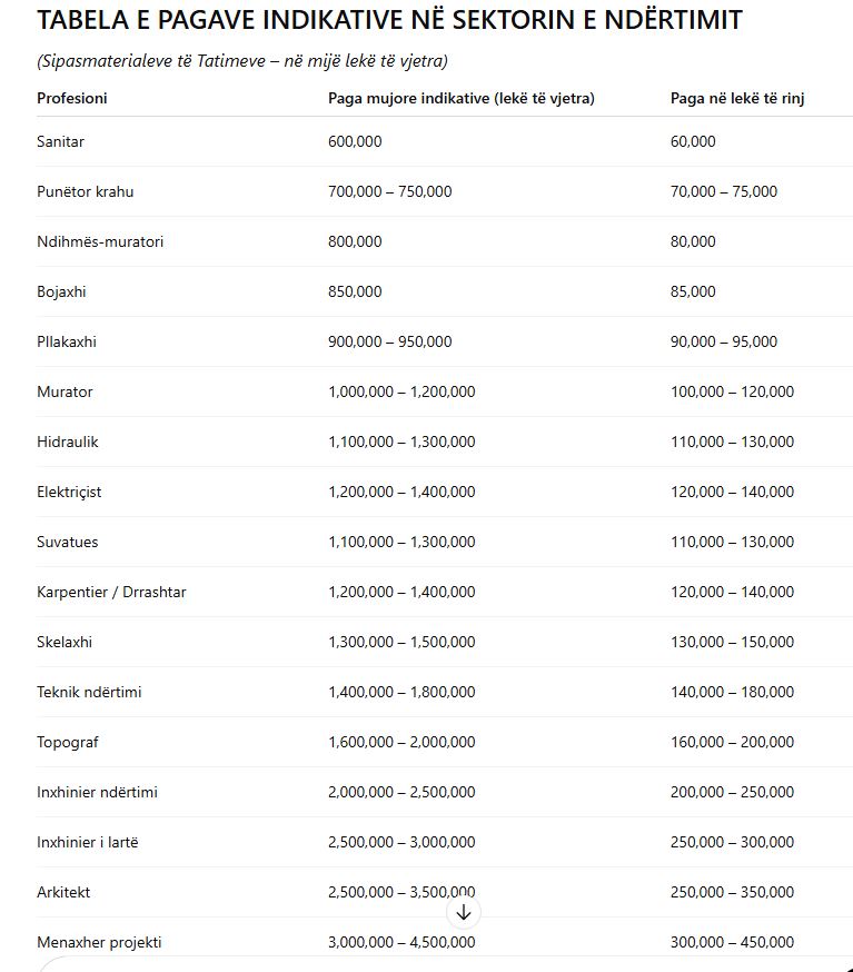 Drejtoria e Përgjithshme e Tatimeve ka vendosur një dysheme të re pagash për sektorin e ndërtimit, duke përcaktuar se nga dhjetori 2025 e në vijim nuk do të lejohet deklarimi i pagave më të ulëta se 80 mijë lekë të rinj. Ky vendim synon reduktimin e informalitetit, një problem i theksuar në industrinë e ndërtimit ku shpesh pagat raportohen më të ulëta se pagesa reale e marrë nga punonjësit.