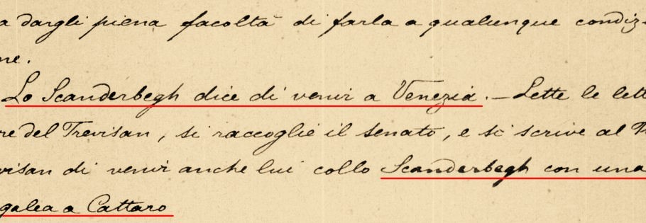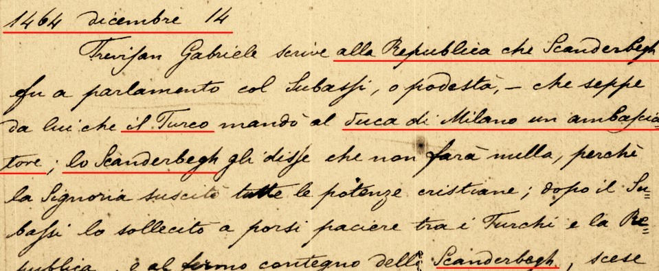 Plot 561 vite më parë një dokument i datës 14 dhjetor të vitit 1464, që ruhet në arkiva të Republikës së Venedikut, hedhë dritë për hamendjet e përkohshme të Republikës së Venedikut, dhe Dukatit të Milanos për tu bërë shok i luftërave të Gjergj Kastriotit-Skënderbeut. Dokumenti në fjalë zotëron vlera të llojllojshme, meqë provon për të dëshmuar se sa ishte gatishmëria luftarake evropiane pas vdekjes së Enea Silvio Piccolomini (Papa Pius II, 1458-1464), përball fitoreve gjithnjë e më të mëdha të sulltan Mehmetit II-Pushtuesit, i cili vite më parë kishte pushtuar despotatin e Rashës (Serbisë, 1459), dhe mbretërinë e Bosnjës (1463), huajtet sa më lart nga HAZU, Annali Veneti, publikuar nga Jahja Drançolli.