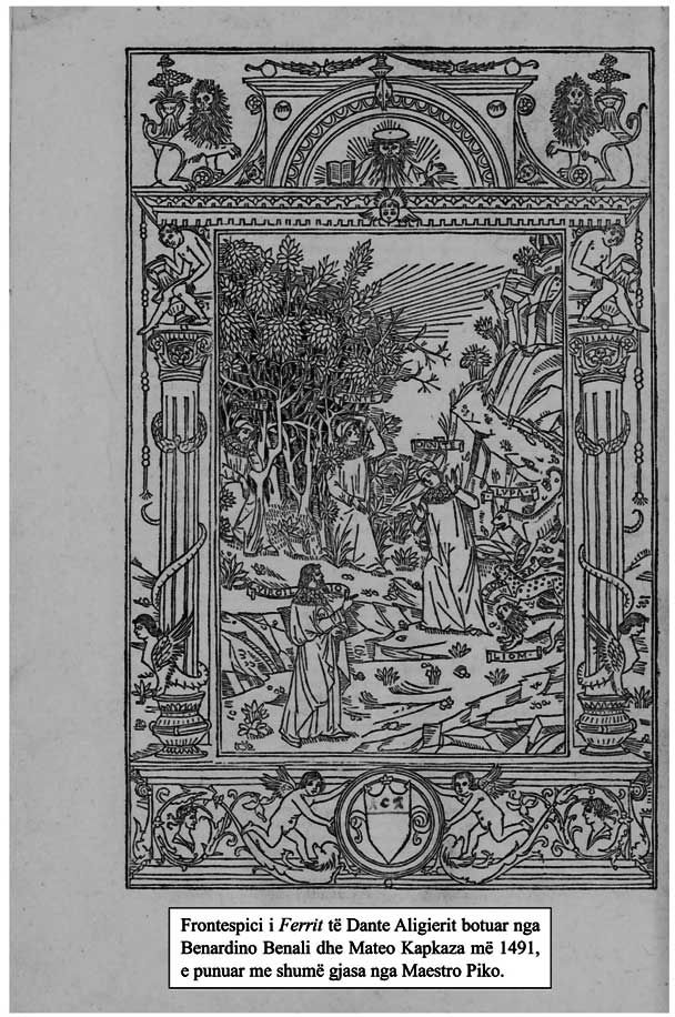 Benardino Benali me 3 mars të vitit 1491 bashkë me Mateo Kapkazën (Kodekën) nga Parma kishin botuar kolanën e parë të Komedisë Hyjnore të Dantes, që është madje edhe e para e ideuar si kolanë në fushën e botimeve të shtypshkruara, e mbajtur si një nga botimet më cilësore për kohën, e komentuar nga Kristoforo Landini, me një aparat ksilografik të plotë, në të cilën gjendet edhe nga një frontespic për secilën kantikë, me kornizë të njëjtë dhe me përmbajtje të ndryshme. Matheo di Codecá da Parma (Matteo Capcasa) më 29 nëntor 1493, pra ish-bashkëbotuesi i Benalit, e riboton këtë kolanë i vetëm, me ndonjë ndryshim të vogël. Frontespicet janë po ato të botimit të parë, por me një ndryshim vetëm për kantikën e Ferrit, frontespici i së cilës shoqërohet me një kornizë shtesë, siç do të shihet në ilustrimet e mëposhtme. Më 11 tetor të 1497 botohet Danthe alighieri fiorentino për Piero de Zuanne di Quarengii vetëm me një frontespic ksilografik për Ferrin, që është po ai i botimit të Mateo Kapkazës të 1493. Po kjo kolanë, Danthe alighieri Fiorentino historiado, me pak ndryshime, botohet më 12 qershor 1507 nga Bartholomeo de Zanni, vetëm me një frontespic, me atë të Ferrit të botuar më 1491. Si ilustrime më poshtë do të sjellim imazhet e frontespiceve të botimit 1491 dhe atë të Ferrit të botimit 1493.