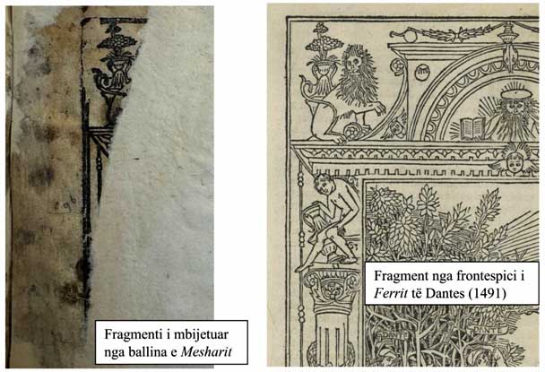 Tashmë dimë se grafemat e përdorura për shtypshkrimin e Mesharit janë po ato të përdorura nga Benardino Benali në veprat e botuara nga 1491 deri rreth 1520, gjithmonë nga të dhënat që zotërojmë deri më tani. Pikërisht për këtë arsye i jemi drejtuar në fillim botimeve të Benalit për të gjetur ndonjë frontespic që të përmbante fragmentin e mbijetuar të Mesharit. Duke shikuar me vëmendje frontespicet e botimeve të tij, nga i cili kanë mbijetuar rreth 200 vepra, kemi zbuluar se ai është i pari që ka përdorur një kornizë ksilografike, ku gjendet edhe fragmenti i lartpërmendur. Këtë kornizë balline, gjithmonë me brendi të ndryshme, e kemi gjetur: 1. Te botimet dhe ribotimet e Komedisë Hyjnore të Dantes; 2. Te botimet dhe ribotimet e Ngadhënjimeve të Petrarkës dhe 3. Te disa vepra të tjera të kësaj periudhe, por zakonisht nga të njëjtit shtypshkrues.