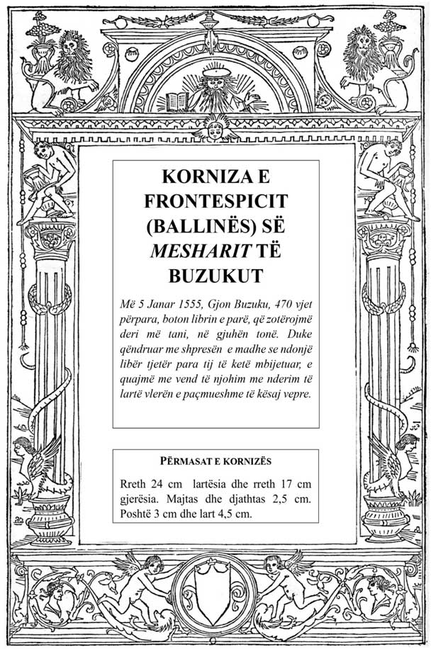 Frontespici i Mesharit të Gjon Buzukut mbetet një nga ato gjurmë të rralla ku historia e librit, arti i shtypshkrimit venedikase dhe identiteti i një gjuhe që po kërkonte vendin e saj në botën e kulturës prekin njëri-tjetrin me një finesë pothuaj hyjnore. Korniza e dëmtuar e ballinës, e ruajtur në fletën 96 të kopjes vatikanase, ngjan sot si një ftesë për të hyrë në laboratorin ku lindi libri i parë i shqipes një portë që nuk na e zbulon më brendinë, por na lë të sodisim disi mistershëm bukurinë e saj të amputuar nga koha.