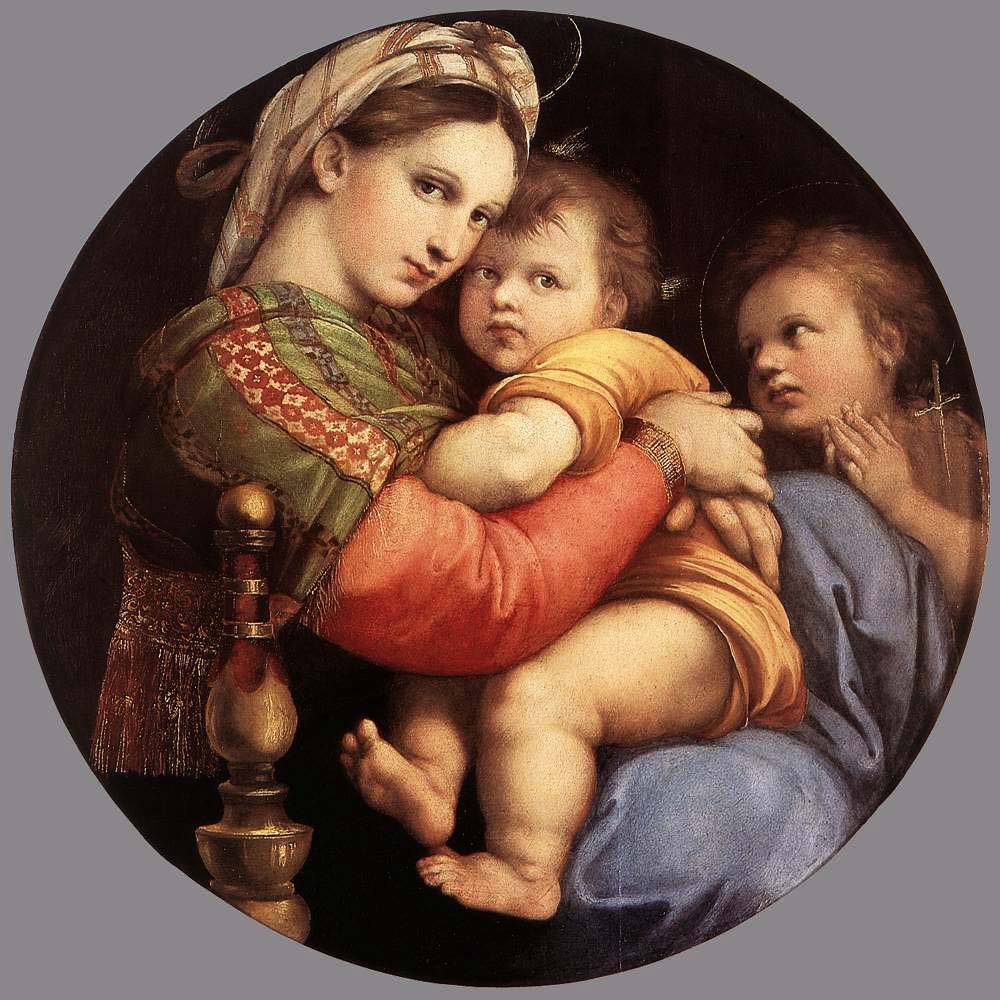 Gjithsesi ky është fakt, fëmija Jezus në tablotë e Rafaelit është i trishtuar, edhe pse ai gjithnjë gjendet në krahët e nënës së shenjtë, Mari. Fëmija Jezus në asnjë nga punët e mjeshtrit nuk është qeshur, shprehia e Tij e fytyrës e ka të poamundur ta shkruar qoftë dhe një notë të vetme të haresë. Piktori në shprehinë e syve të fëmijës Jezus, por edhe të kerubinëve, reflekton çfarë shohin sytë e tij, çfarë e trazon atë në shpirt, çfarë e shtytë në mendime dhe e cyt në vepër, sendërgjuar me delikatesë dhe përkujdesje nëpërmjet ngjyrave, dritëhijes dhe tërësisë së asaj që mëton çfarë shpërfaqet.