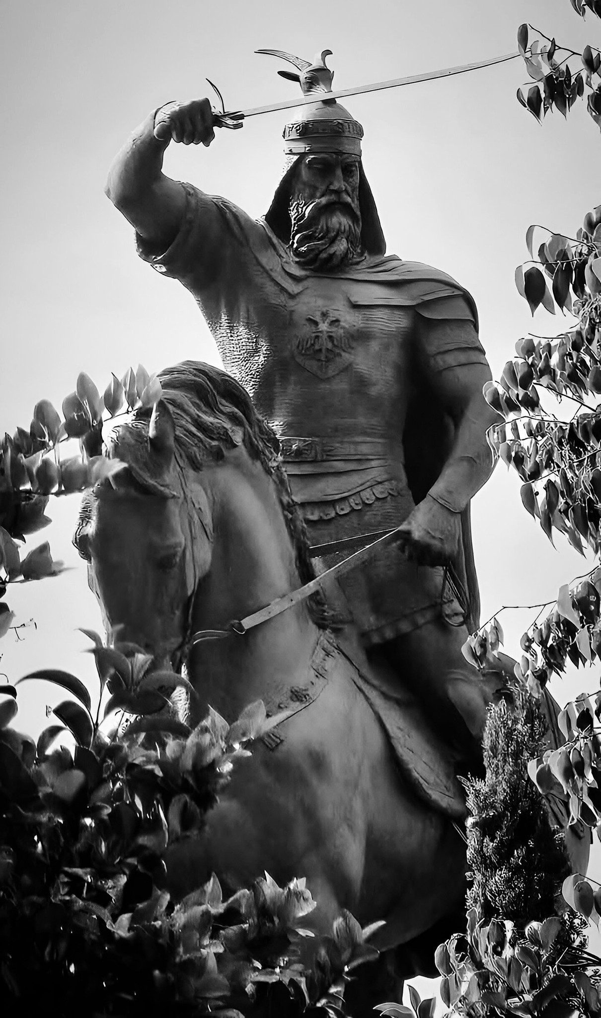 Autorët arrijnë të krijojnë një sintezë të fuqishme midis masës, ritmit dhe lëvizjes, duke përdorur gjestin e ngritjes së shpatës si bosht kompozicional. Kjo linjë diagonale, e përforcuar nga tensioni i qafës së kalit dhe qëndrueshmëria e trupit njerëzor, përçon një ndjesi të qartë forcë, heroizmi dhe vendosmërie.