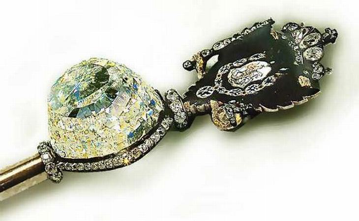 2. Diamanti Cullinan – Me një peshë 3,106 karat, Diamanti Cullinan është thjesht diamanti më i madh i zbuluar ndonjëherë. Ai u zbulua në minierën kryesore të Afrikës së Jugut në 1905 dhe u emërua pas Thomas Cullinan, njeriu që e zotëronte atë. Ai u paraqit si një dhuratë për Mbretin Edward VII të Anglisë në gjendjen e tij të përafërt, natyrore në vitin 1907. Firma Amsterdam I.J. Asscher mori komisionin mbretëror për të prerë gurin, dhe prodhoi nëntë gurë (Cullinans I-IX, njëra prej të cilave mund të shihni më sipër), si dhe 96 diamante të vegjël.