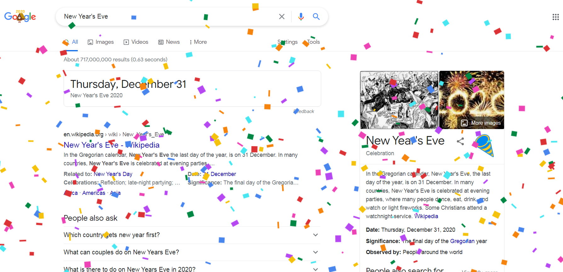 Pikërisht për të shënuar këtë ditë, Google ka sjellë një logo ndryshe nga ajo që jemi mësuar. Një logo e zbukuruar me drita për t’i shtuar shkëlqimin, një shtëpizë në mes dhe një orë që pret të prekë mesnatën. Nëse klikoni në faqen tuaj do të derdhen një lumë konfeti.