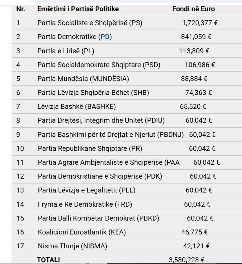 Komisioni Qendror Zgjedhor ka shpërndarë për 17 partitë politike fondin vjetor 2026 me një total prej 3.580.228 euro. Pjesën më të madhe e ka marrë Partia Socialiste, 1.720.377 euro.