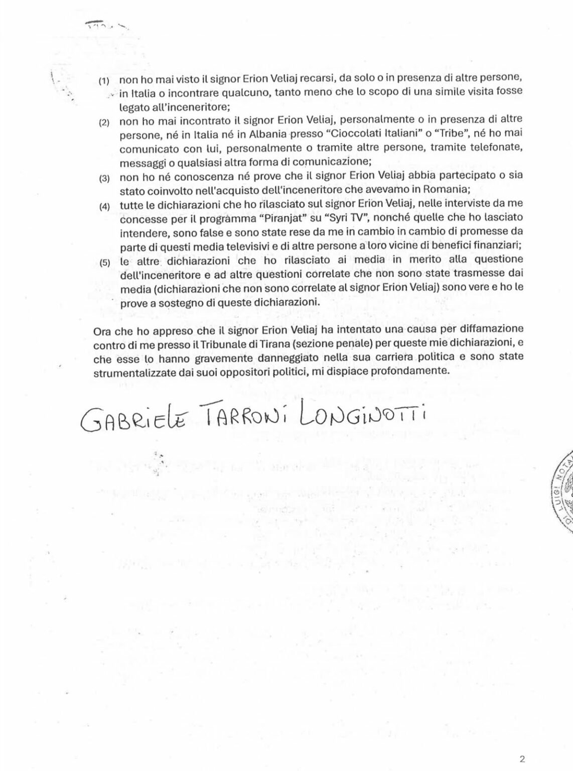 Në këtë dokument, Longinotti tërhiqet nga çdo akuzë e mëparshme, duke pranuar se deklarimet e tij ishin të pavërteta dhe të nxitura nga premtime financiare.