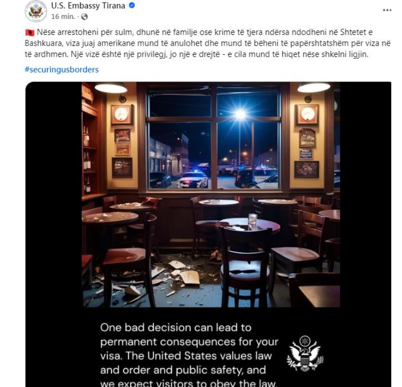 “Nëse arrestoheni për sulm, dhunë në familje ose krime të tjera ndërsa ndodheni në Shtetet e Bashkuara, viza juaj amerikane mund të anulohet dhe mund të bëheni të papërshtatshëm për viza në të ardhmen. Një vizë është një privilegj, jo një e drejtë, e cila mund të hiqet nëse shkelni ligjin”, thuhet në njoftimin e ambasadës.
