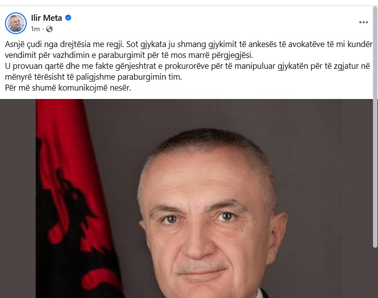 Presidenti i Partisë së Lirisë, Ilir Meta ka reaguar pasi Apeli i GJKKO e la atë sërish në qeli, duke mos shprehur asnjë çudi nga “drejtësia me regji”, siç e quan ai.