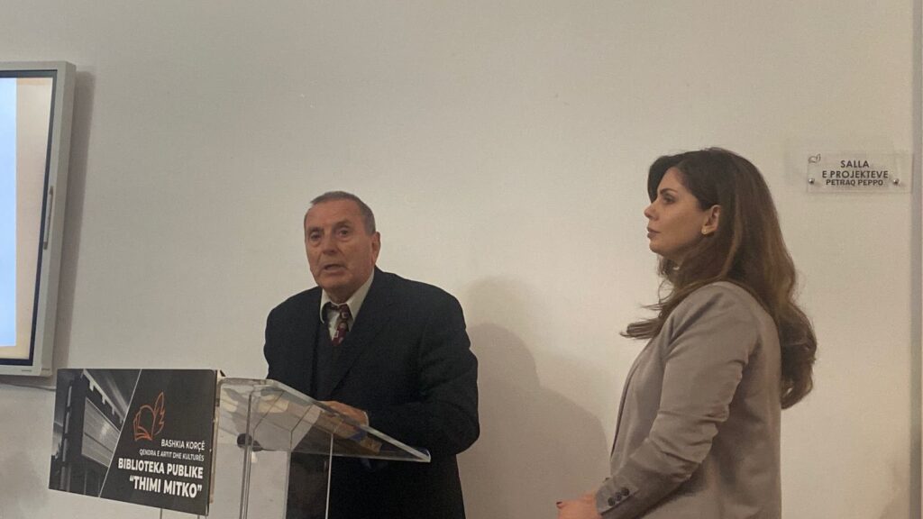 Leonidha Peppo gjatë fjalës së tij në aktivitetin e zhvilluar në Bibliotekën Publike “Thimi Mitko”, Korçë