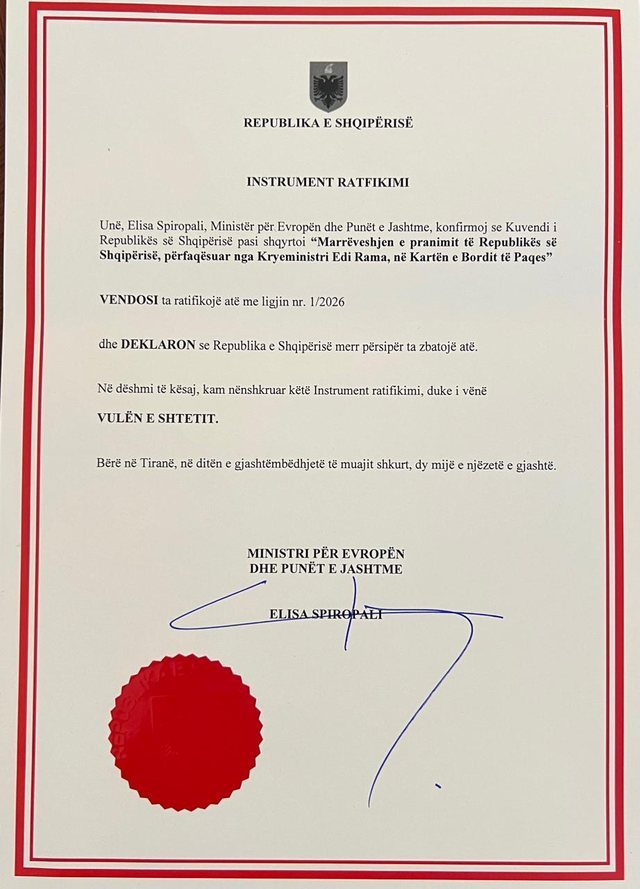 Ambasada e Shqipërisë në Shtetet e Bashkuara të Amerikës ka njoftuar se Shqipëria ka depozituar pranë Qeverisë së SHBA-së instrumentin e ratifikimit të marrëveshjes për pranimin në Kartën e Bordit të Paqes. Ambasada e Shqipërisë thekson se ky hap formalizon përfundimisht angazhimin në këtë iniciativë të rëndësishme dhe përfaqëson një tjetër moment domethënës në thellimin e rolit të Shqipërisë në promovimin e paqes, stabilitetit dhe bashkëpunimit ndërkombëtar. Sipas njoftimit, depozitimi i instrumentit të ratifikimit pranë Qeverisë së SHBA-së përmbyll procedurat kushtetuese dhe i jep fuqi të plotë juridike angazhimit të ndërmarrë