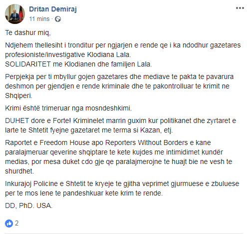 Ndjehem thellësisht i tronditur për ngjarjen e rëndë që i ka ndodhur gazetares profesioniste/investigative Klodiana Lala.