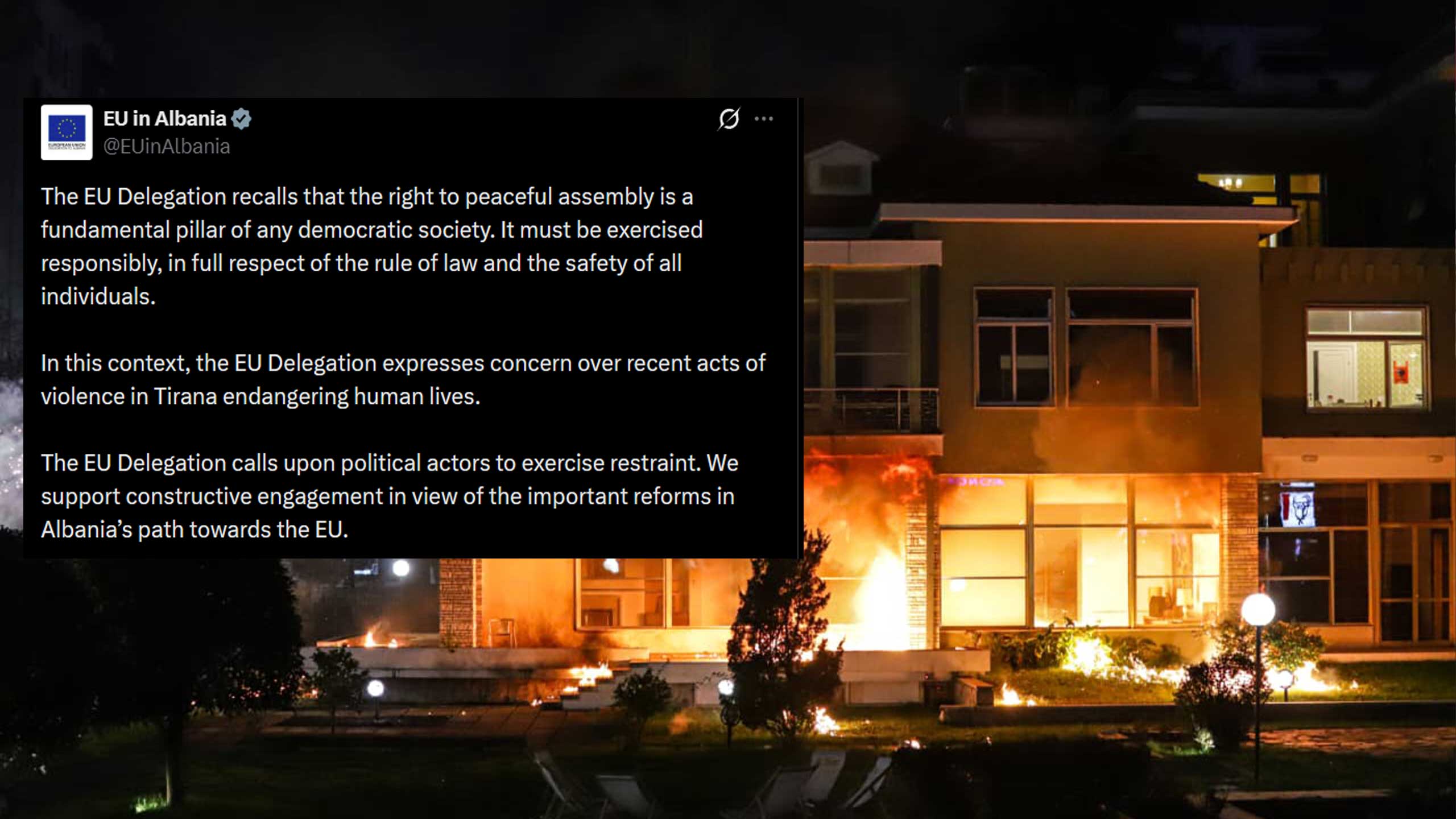 Në një postim të publikuar në platformën X, Delegacioni thekson se e drejta për tubim paqësor është një shtyllë themelore e çdo shoqërie demokratike, por ajo duhet të ushtrohet me përgjegjësi dhe në respekt të plotë të sundimit të ligjit dhe sigurisë së të gjithë qytetarëve.