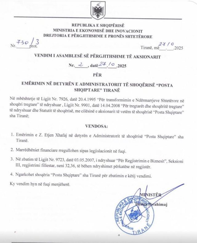 Ish-deputeti i PS-së, Etjen Xhafaj është emëruar në detyrën e administratorit të shoqërisë “Posta Shqiptare” sh.a. Vendimi është firmosur nga ministrja e Ekonomisë dhe Inovacionit, Delina Ibrahimaj. Me këtë emërim, ai merr drejtimin e një prej institucioneve më të vjetra publike të vendit, në një moment kur “Posta Shqiptare” ndodhet në proces transformimi dhe digjitalizimi të shërbimeve.