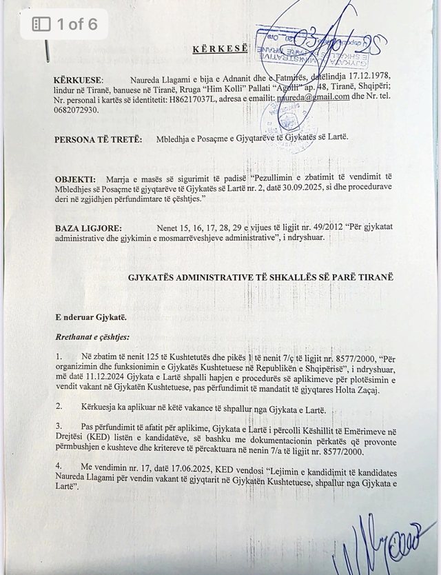 Por në kërkesën e saj, Llagami i referohet vendimit nr. 2, datë 30 shtator 2025, të Mbledhjes së Posaçme të gjyqtarëve të Gjykatës së Lartë, duke kërkuar që ai të pezullohet deri në zgjidhjen përfundimtare të çështjes. Sipas dokumentit, procedura nisi pas përfundimit të mandatit të gjyqtares së Gjykatës Kushtetuese, Holta Zaçaj, në dhjetor 2024. Gjykata e Lartë shpalli hapjen e aplikimeve, ku ndër kandidatët aplikoi edhe Naureda Llagami.