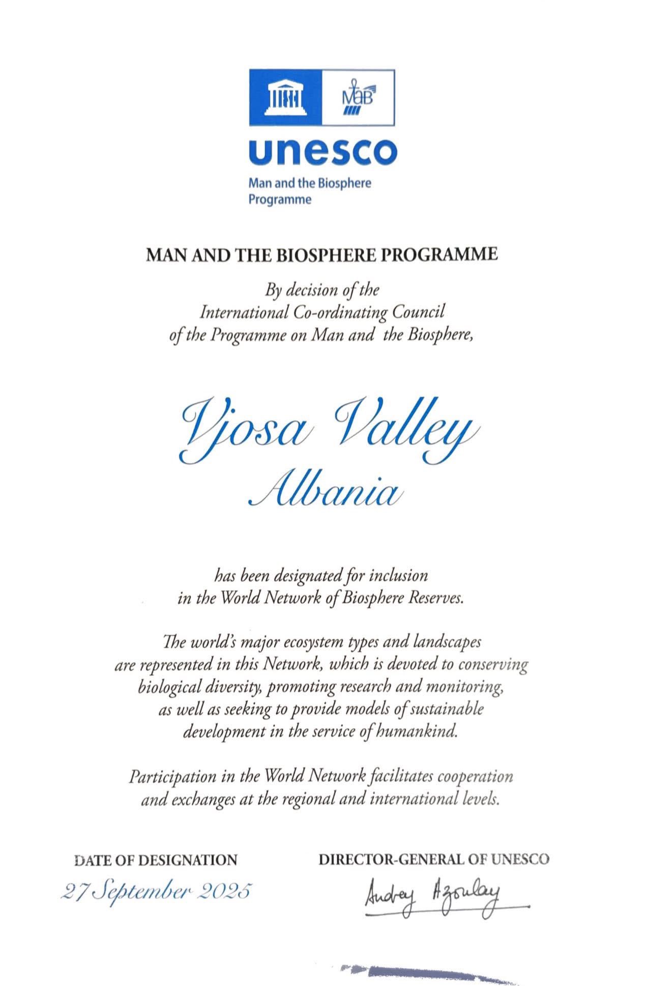Kryeministri Edi Rama bën me dije se UNESCO ka dhënë rekomandimin zyrtar për përfshirjen e Luginës së Vjosës në programin “Njeriu dhe Biosfera” dhe shpalljen e saj si zonë me vlerë botërore natyrore.
