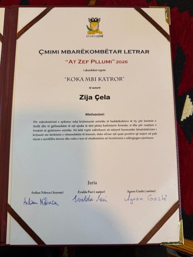 Shkrimtari Zija Çela është vlerësuar me Çmimin Mbarëkombëtar Letrar “At Zef Pllumi” për veprën “Koka mbi katror”, një libër që dëshmon për një marrëdhënie të rrallë midis krijuesit dhe lexuesit, midis vëzhgimit kritik dhe përjetimit artistik. Ky çmim, që mban emrin e At Zef Pllumi, nuk është vetëm një dekoratë simbolike, por një akt vlerësimi që synon të mbajë gjallë një etikë të shkrimit dhe një përkushtim ndaj së vërtetës, ashtu siç e mishëroi vetë figura e tij.