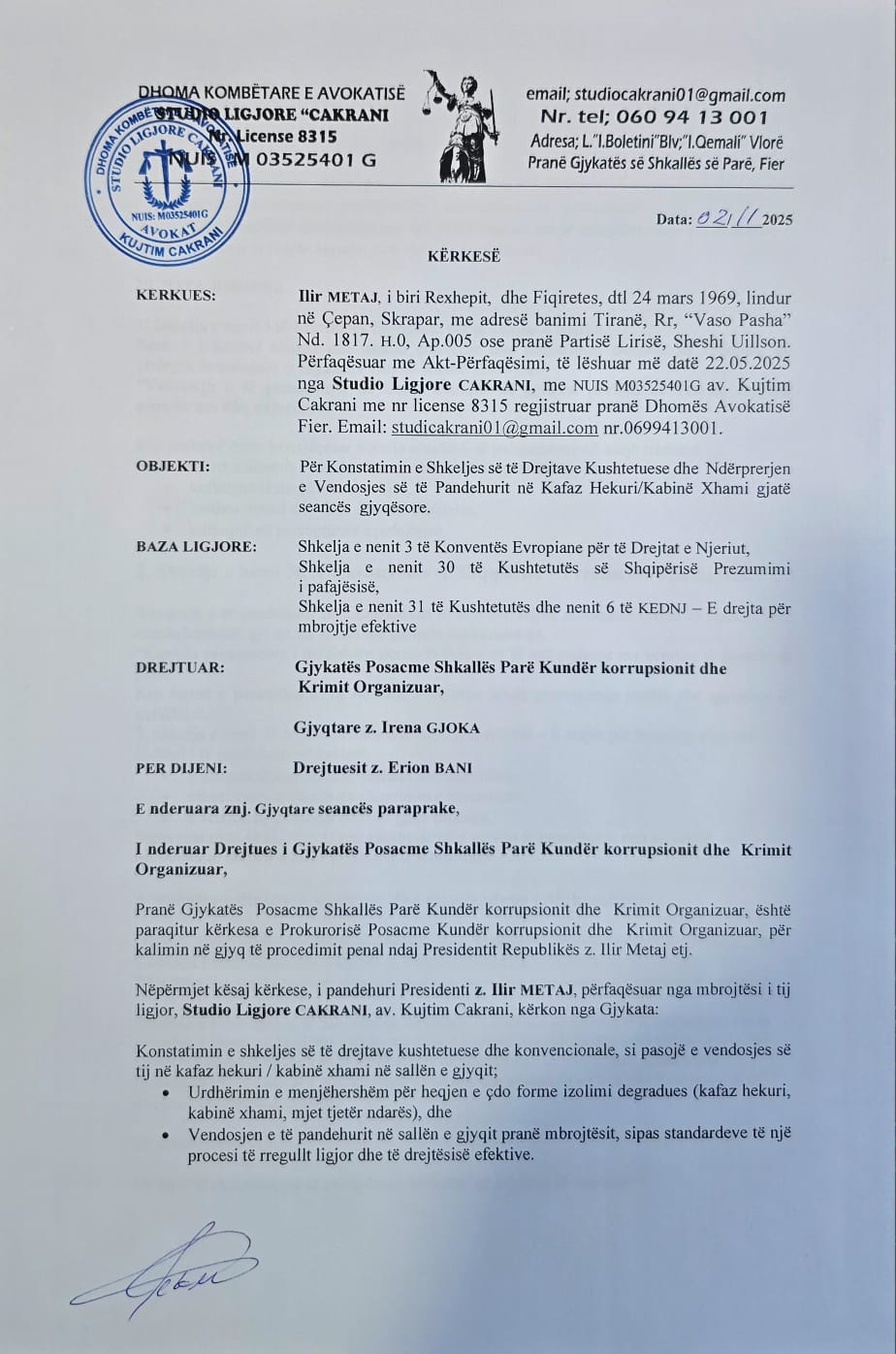 Presidenti i PL-së, Ilir Meta ka kërkuar që të mos futet në kafaz metalik gjatë seanca gjyqësore. Kërkesa është depozituar sot në GJKKO përmes avokatit të tij Kujtim Cakrani, në të cilën kërkon që të jetë në sallën e gjyqit pranë mbrojtësve të tij pa barriera fizike, dhe në përputhje me të drejtën e mbrojtjes efektive.