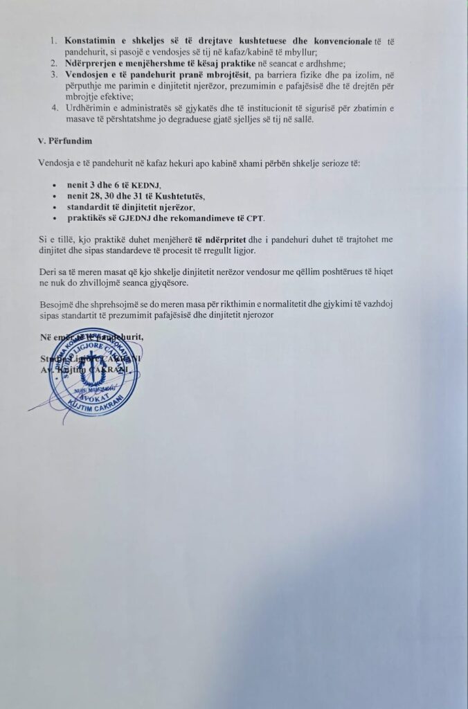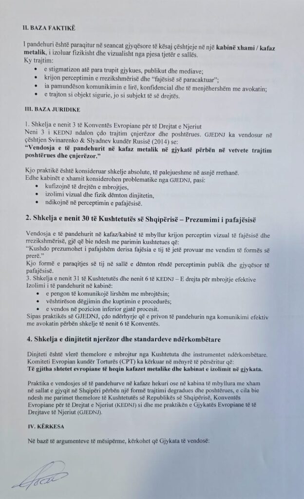 “Si e tillë, kjo praktikë duhet menjëherë të ndërritet dhe i pandehuri duhet të trajtohet me dinjitet dhe sipas standarteve të procesit të rregullt ligjor. Derisa të merren masat që kjo shkelje e dinjitetit njerëzor vendosur me qëllim poshtërues të hiqet, ne nuk do të zhvillojmë seanca gjyqësore. Besojmë dhe shpresojmë se do merren masa për rikthimin e normalitetit dhe gjykimi të vazhdojë sipas standartit të prezumimit të pafajësisë dhe dinjitetit njerëzor”, thuhet në kërkesë.