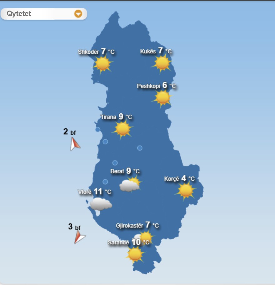 Era do të fryjë me drejtim juglindje-veriperëndim 7m/s, ndërsa përgjatë vijës bregdetare në jug dhe në lugina era pritet të arrijë shpejtësi deri 17m/s