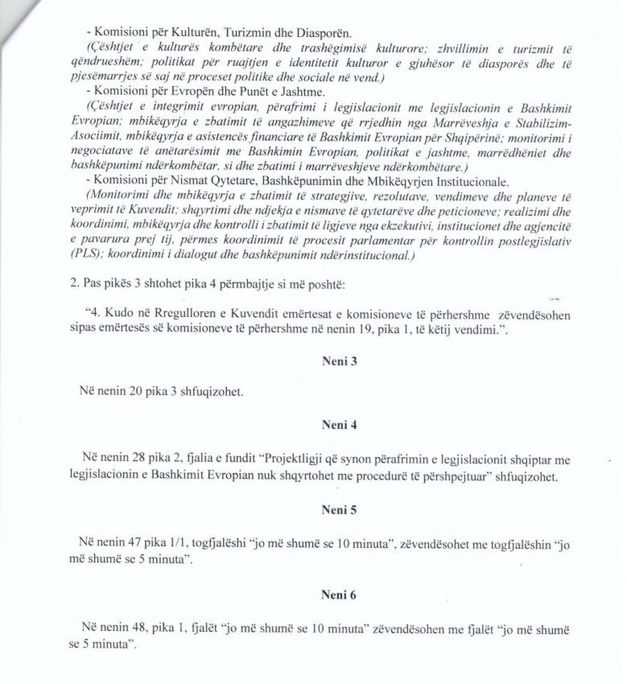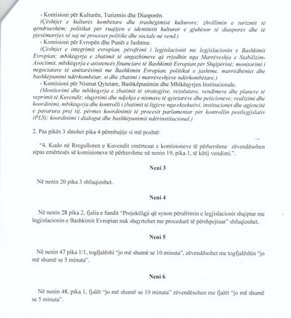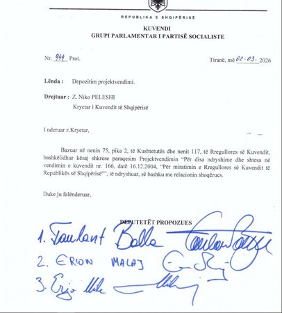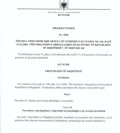 PS-ja ka depozituar në Kuvend një draft me ndryshime në Rregulloren e Parlamentit, ku kërkohet përgjysmimi i kohës së diskutimeve në seancë plenare nga 10 në 5 minuta për ministrat dhe deputetët. Në draftin që mban firmën e kreut të grupit parlamentar socialist Taulant Balla dhe dy deputetëve të tjerë, Erjon Malaj dhe Erjon Mile, parashikohet gjithashtu që projektligjet që lidhen me procesin e integrimit evropian dhe zbatimin e Marrëveshjes së Stabilizim-Asociimit të shqyrtohen me procedurë të përshpejtuar. Ndryshimet përfshijnë edhe riorganizimin e komisioneve parlamentare, forcimin e kontrollit post-legjislativ dhe rregulla të reja për raportimin e institucioneve të pavarura dhe trajtimin e nismave qytetare.