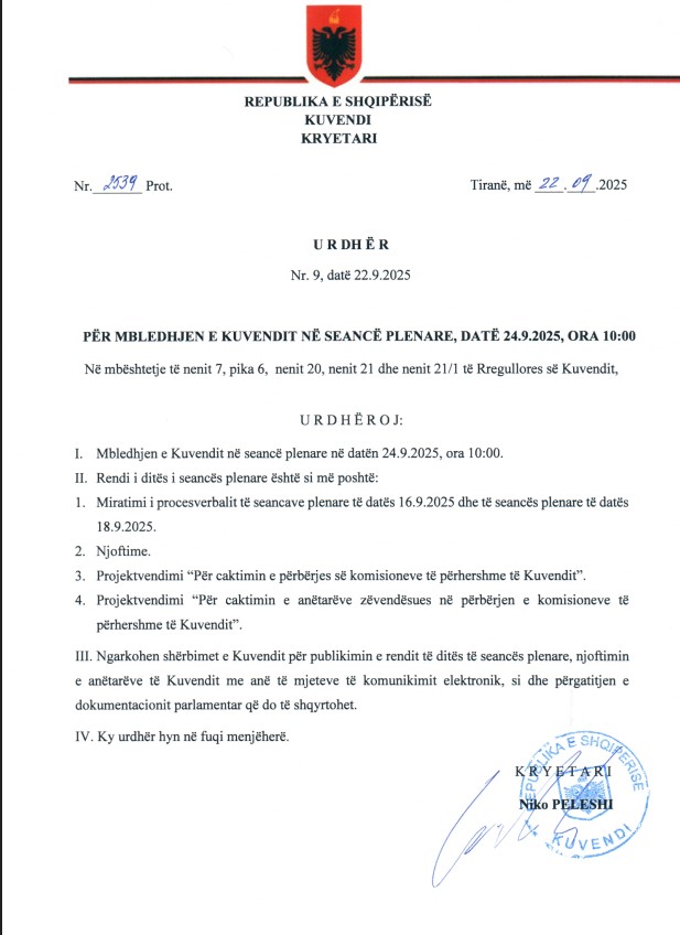 Ju njoftojmë se seanca plenare e Kuvendit të Shqipërisë do të zhvillohet ditën e mërkurë, datë 24 shtator, ora 10:00. (Urdhër nr. 9, datë 22.9.2025, i Kryetarit të Kuvendit, z. Niko Peleshi).
