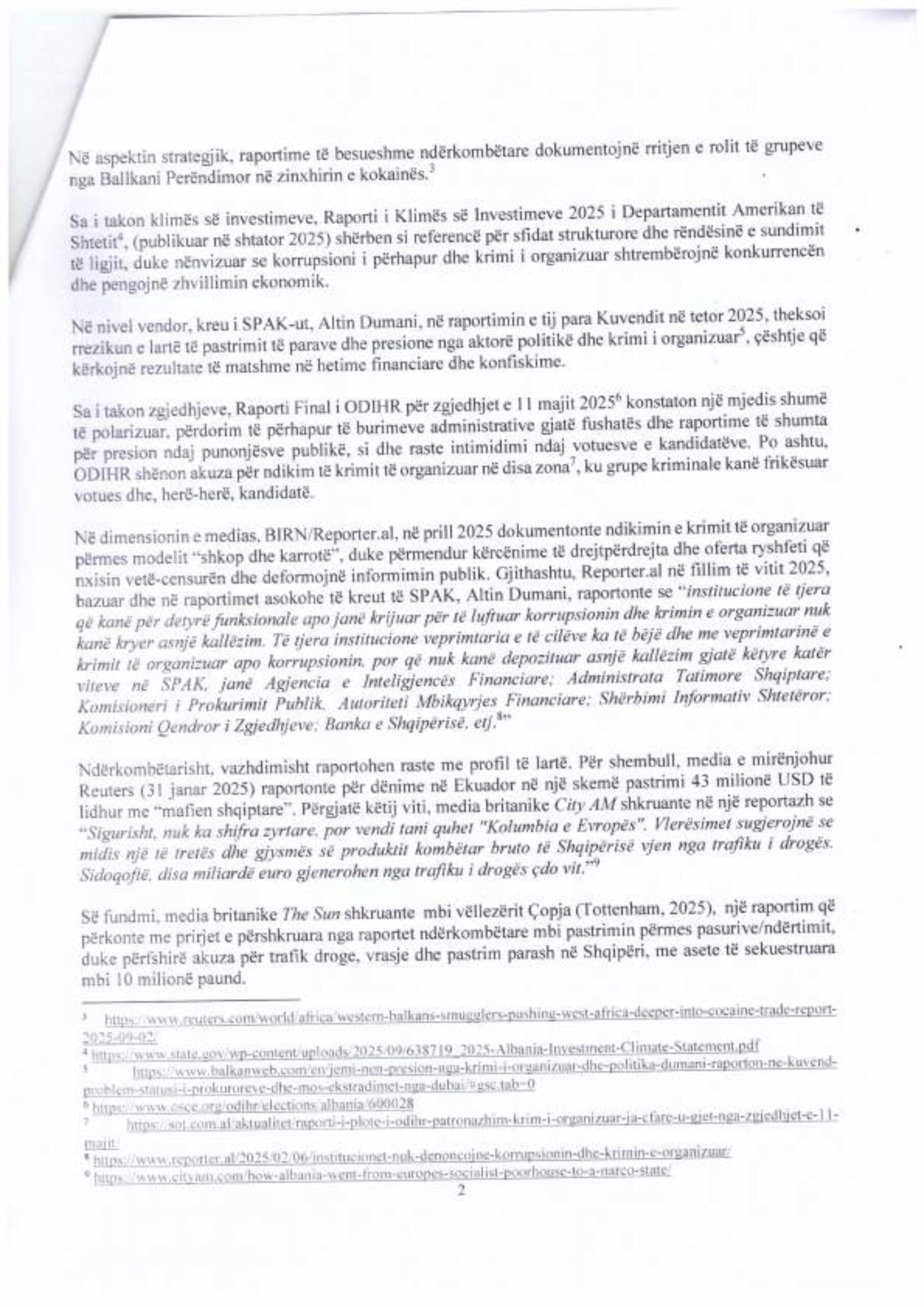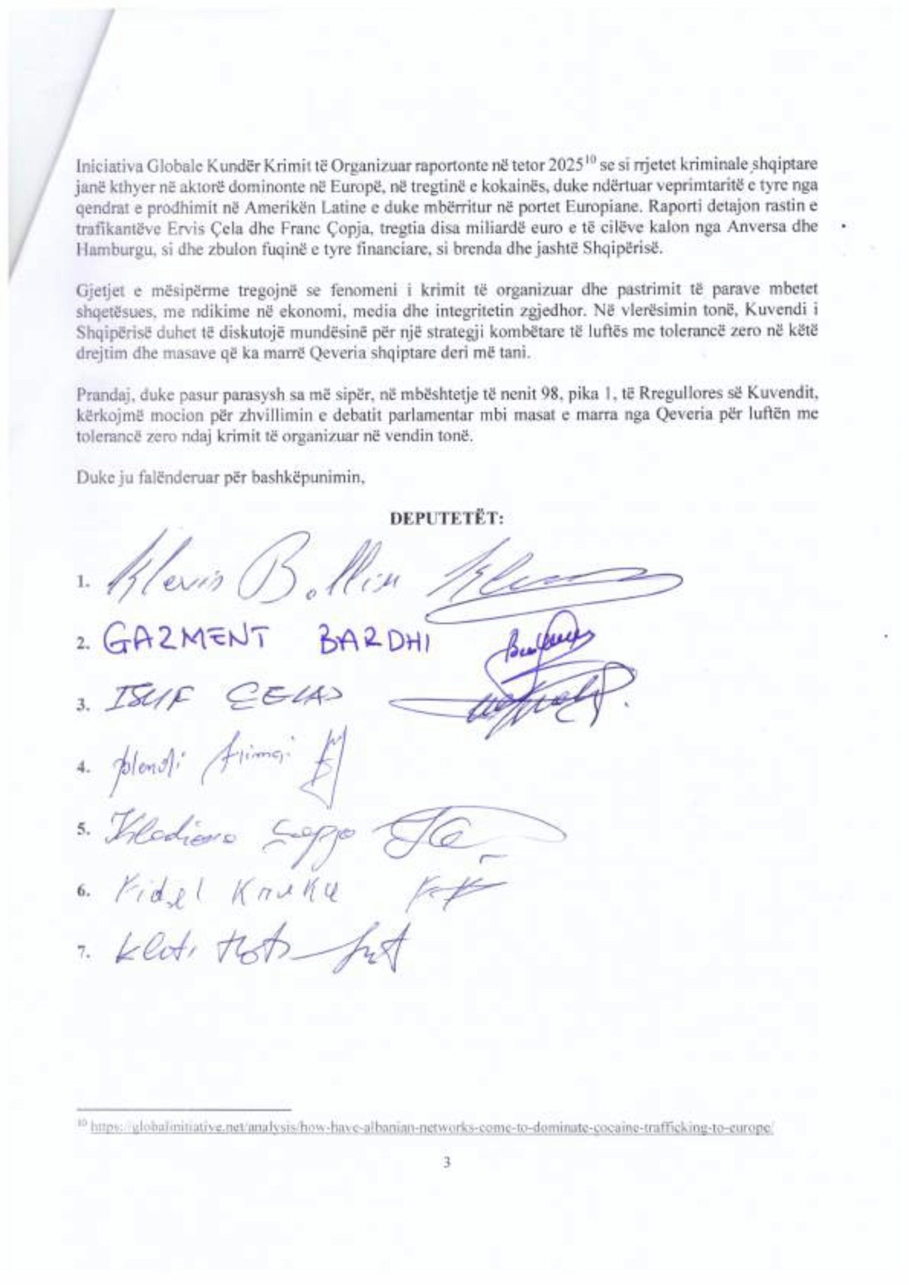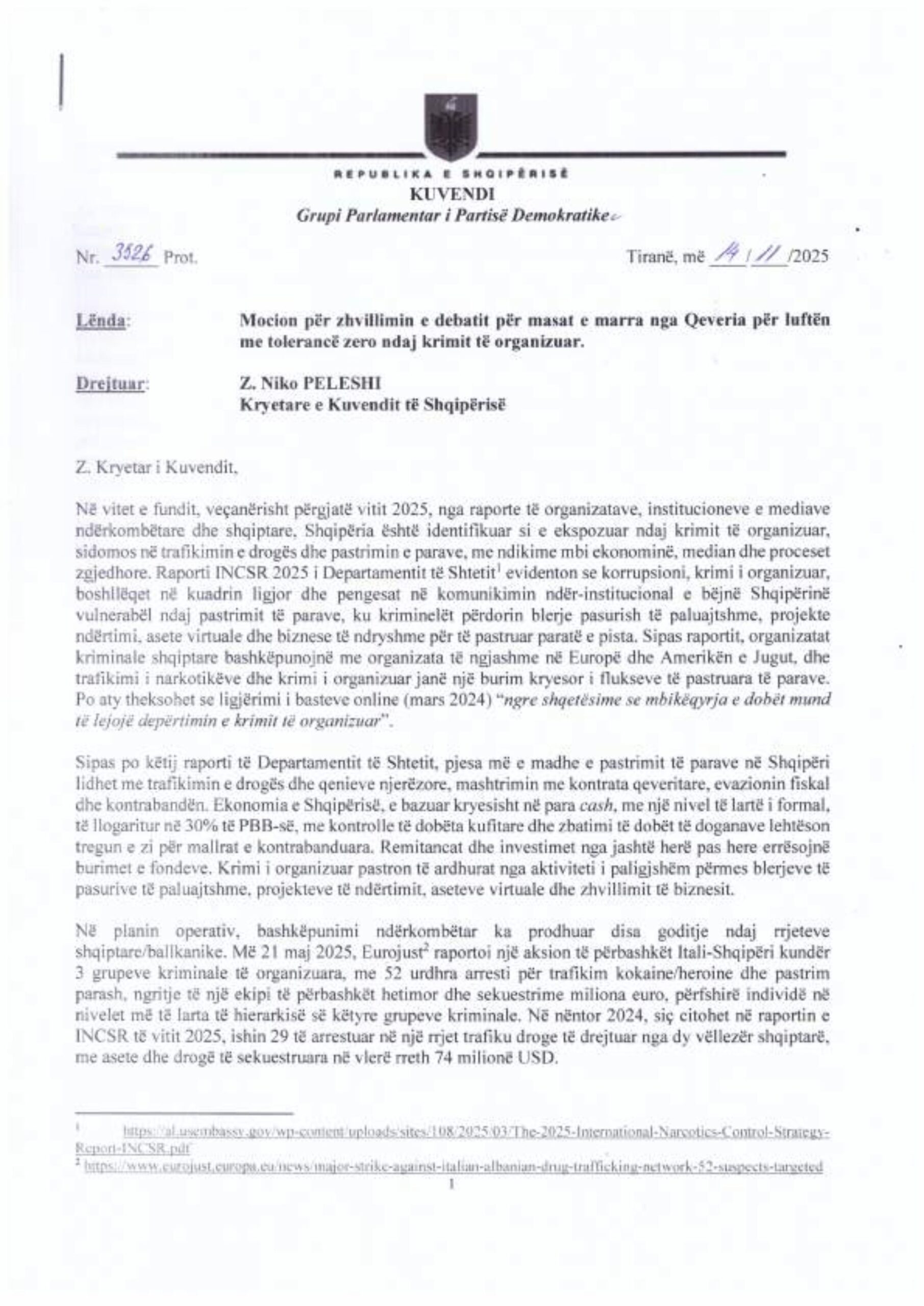 Grupi parlamentar i PD-së kërkon zhvillimin e një debati në Kuvend, duke marrë shkas nga ngjarjet kriminale që kanë tronditur vendin, siç ishte dhe atentati në Rinas. Në kërkesë grupi i referohet raporteve ndërkombëtare, përfshirë raportin e Departamentit Amerikan të Shtetit, i cili flet për pastrim të parave të krimit të organizuar në ndërtime dhe vepra publike.