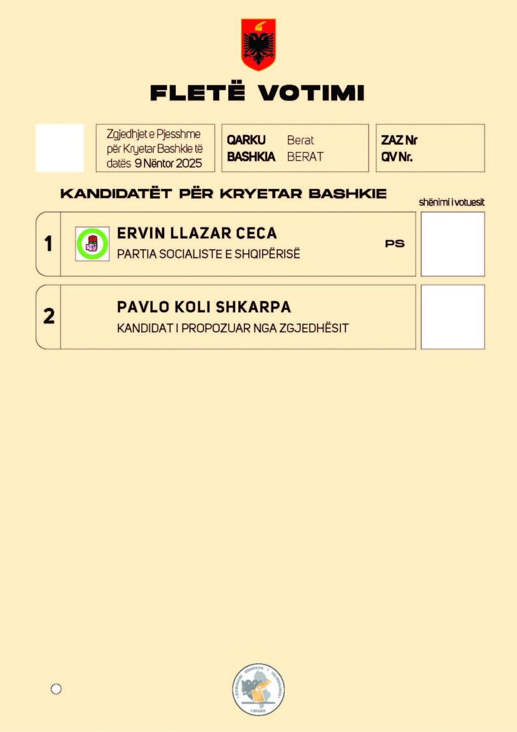 Në bashkinë Berat garojnë Ervin Ceca i PS-së dhe Pavlo Shkarpa i pavarur, i mbështetur nga opozita.