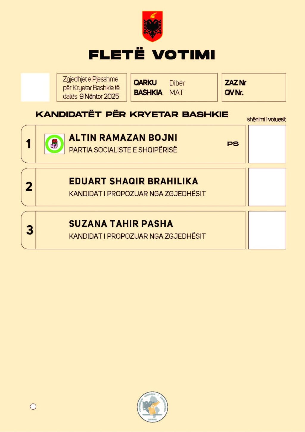 Në bashkinë Mat garojnë Altin Bojni i PS-së, Suzana Pasha e pavarur (kryetare e forumit të gruas së PS në Mat) dhe Eduart Brahilika i pavarur, i mbështetur nga opozita.