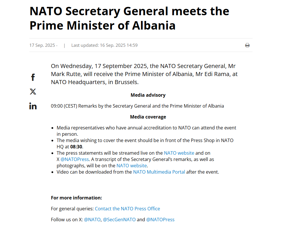 Kryeministri Edi Rama do të takohet ditën e mërkurë (17 shtator) në Bruksel me Sekretarin e Përgjithshëm të NATO-s, Mark Rutte. Takimi sipas axhendës të botuar në faqe zyrtare të NATO-s, do të mbahet në orën 09:00. Takimi Rama-Rutte do të mbahet në selinë e NATO. Rama ndodhet në Bruksel kjo në kuadër të Konferencës së 6 Ndërqeveritare pasi sot BE-ja hapi negociatat për kapitullin “Agjenda e Gjelbër” me Shqipërinë.