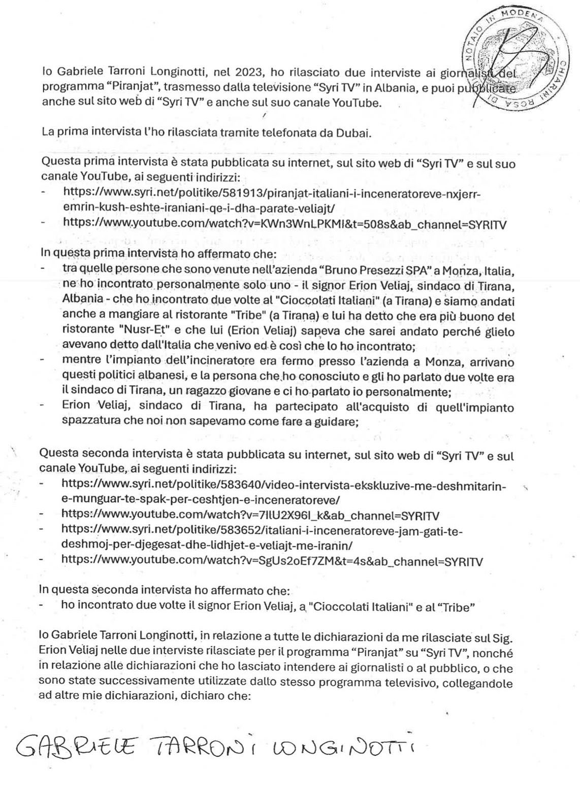 (4) Të gjitha deklaratat që kam dhënë në lidhje me z. Erion Veliaj, në intervistat e mia për programin “Piranjat” në “Syri TV”, si edhe ato që kam lënë të kuptohet, janë të pavërteta dhe janë bërë prej meje në këmbim të premtimeve nga ana e këtyre mediave televizive dhe personave të afërt me to, për përfitime financiare.