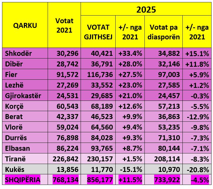 Brenda vendit, si PS edhe PD-ASHM pësuan rënie në numrin e votave krahasuar me 2021 – PS mori 4.5% vota më pak dhe PD-ASHM plot 33% më pak. Por PS-ja mori mbi 122 mijë vota nga diaspora, kurse PD-ASHM vetëm 47 mijë…