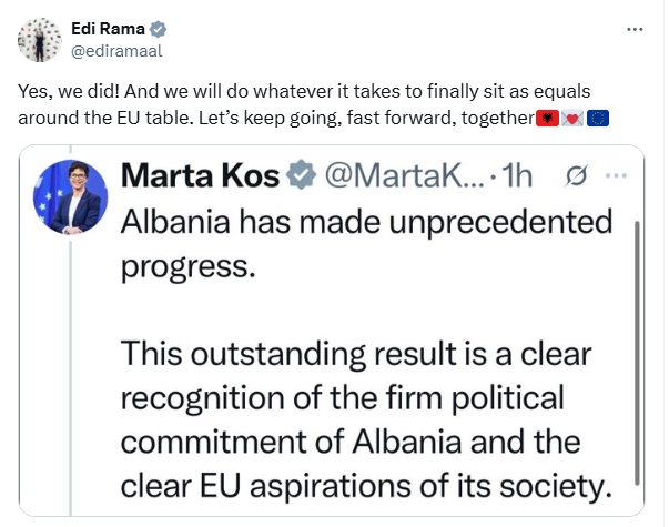 Sakaq kryeministri Edi Rama ka reaguar përmes një postimi në platformën X, duke shkruan se qeveria e tij do të bëjë gjithçka që duhet për t’u ulur më në fund si të barabartë rreth tryezës së BE-së.