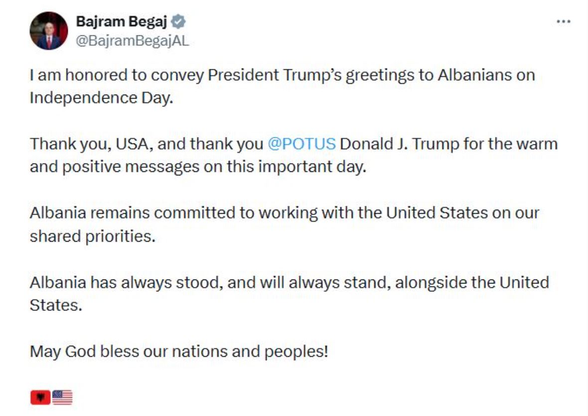 “Në emër të popullit të Shteteve të Bashkuara, ju dërgoj urimet tona më të mira juve dhe popullit të Shqipërisë ndërsa festoni pavarësinë tuaj. Shtetet e Bashkuara dhe Shqipëria gëzojnë një partneritet të fortë të krijuar nga lidhje të ngushta sigurie, ekonomike dhe njerëzore. Pres me padurim forcimin e bashkëpunimit tonë mbi prioritetet e përbashkëta, duke përfshirë stabilitetin rajonal, përballjen me organizatat kriminale ndwrkombwtare dhe zgjerimin e mundësive dypalëshe të biznesit dhe tregtisë. Ju uroj juve dhe popullit të Shqipërisë një Ditë të gëzuar Pavarësie”,-shkruan Presidenti Donald J. Trump në telegramin e tij dërguar Presidentit të Republikës së Shqipërisë.