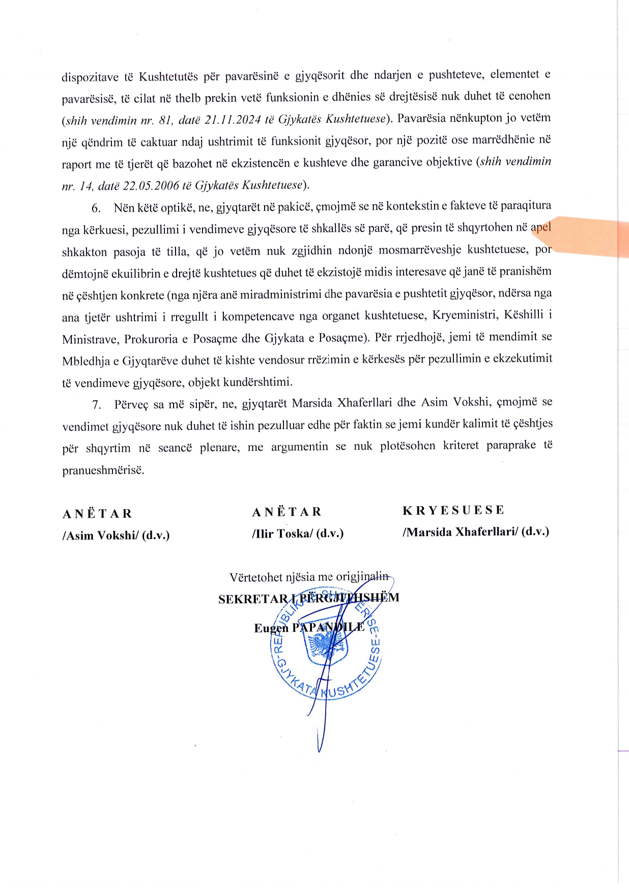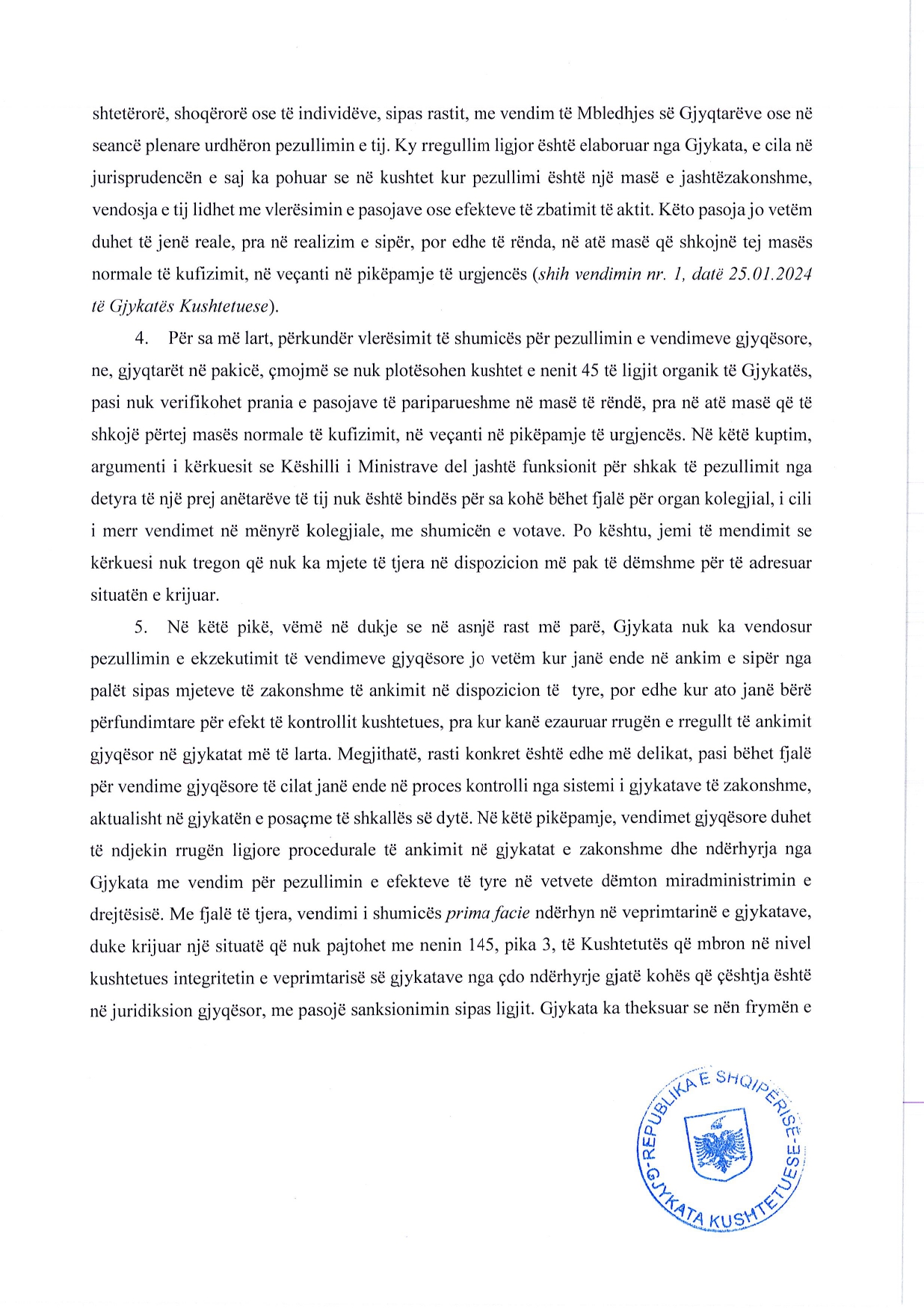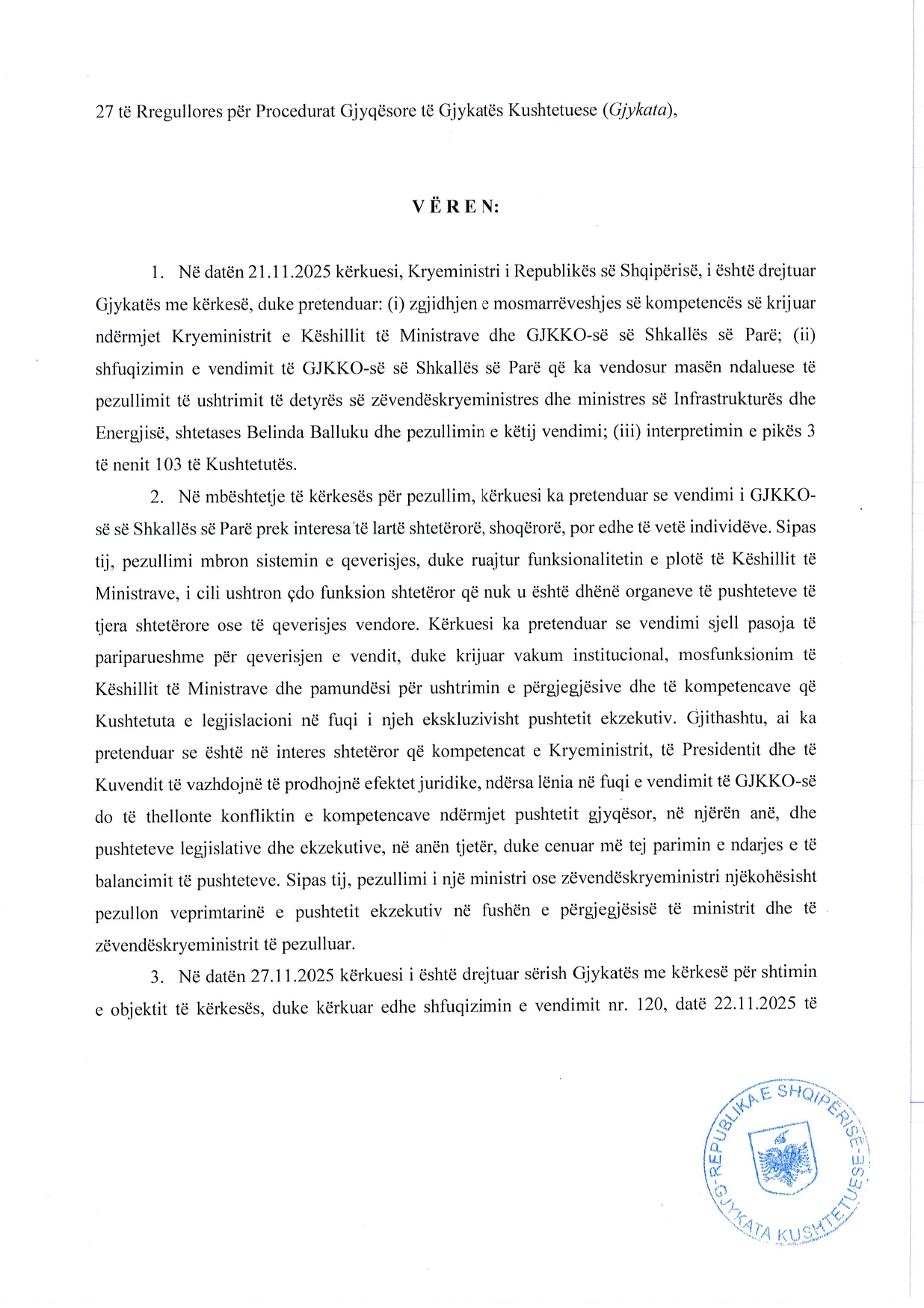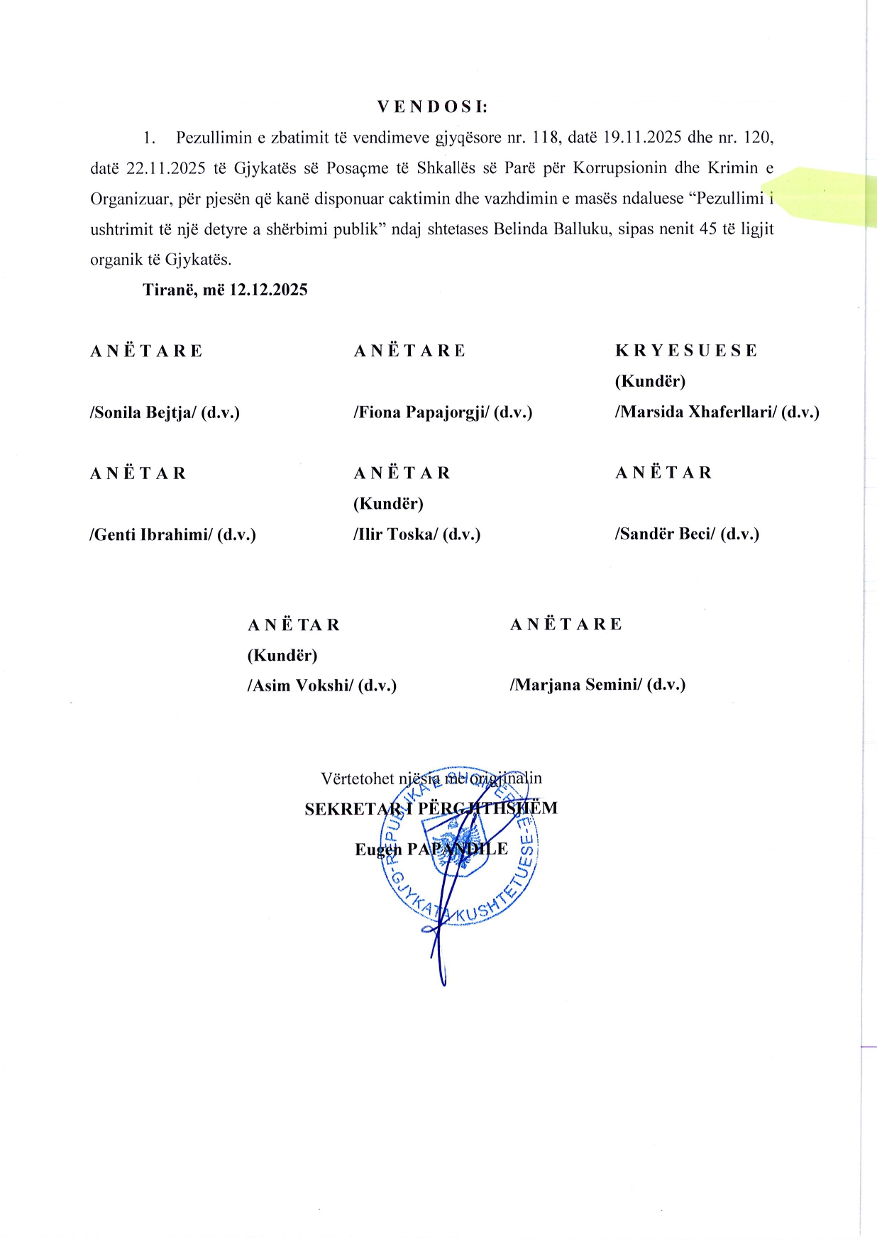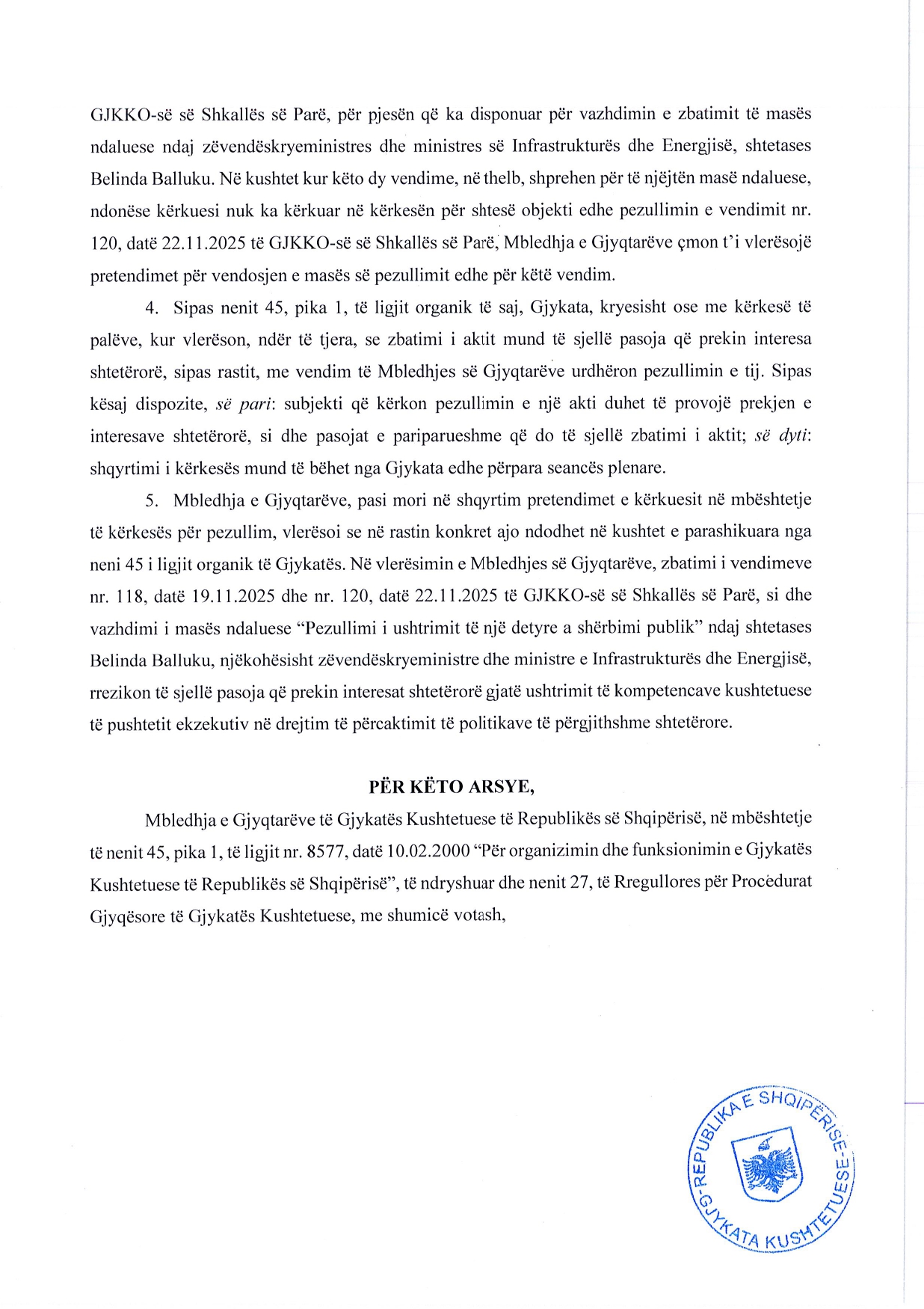 Gjykata Kushtetuese vendosi me 5 vota pro dhe 3 kundër të pezullojë vendimet e GJKKO që ndalonin ushtrimin e detyrës nga zv/kryeministrja dhe ministrja e Infrastrukturës dhe Energjisë, Belinda Balluku, e cila është marrë e pandehur nga SPAK. Në vendimin e plotë, thuhet se gjyqtarët që votuan pro kërkesës së kryeministrit Edi Rama, i cili kërkoi shfuqizimin e vendimit për pezullimin nga detyra, ishin Sonila Bejtja, Gent Ibrahimi, Sandër Beci, Marjana Selimi dhe Fiona Papajorgji, ndërsa kundër votuan Ilir Toska, Marsida Xhaferllari dhe Asim Vokshi.