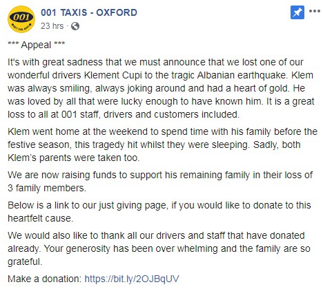 “Me trishtim të madh na duhet të njoftojmë se kemi humbur një nga drejtuesit tanë të mrekullueshëm Klement Cupi në tërmetin tragjik në Shqipëri. Klem ishte gjithnjë i buzëqeshur, gjithmonë bënte shaka dhe kishte një zemër prej ari. Ai ishte i dashur me të gjithë. Ishtë një humbje e madhe për të gjithë në stafin 001, shoferët dhe klientët e përfshirë.