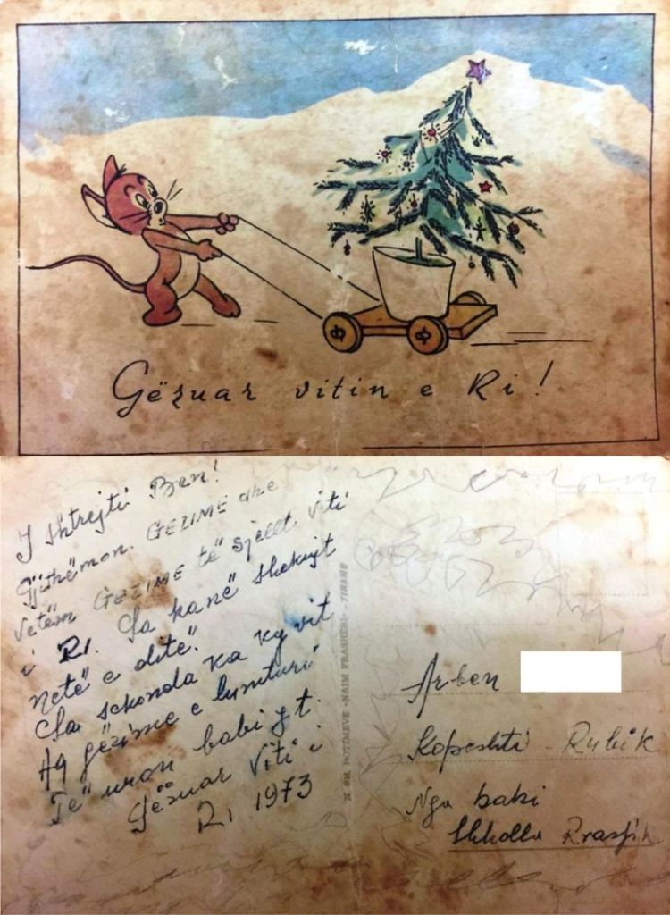 Një tjetër kartolinë e veçantë është ajo e 1973, ku një baba i uronte festat djalit të vet. Ajo që bie në sy është pamja e kartolinës, ku duket një nga personazhet e famshme të filmave për fëmijë si Jerry. Ai shfaqet duke tërhequr një karrocë ku është ngarkuar pema e vitit të ri dhe poshtë tyre urimi tradicional “Gëzuar vitin e ri”. Në pjesën e pasme të kartolinës, lexohet N.SH.BOTIME NAIM FRASHËRI TIRANË. Pra, për fëmijët duket se regjimi bënte një përjashtim, edhe pse çdo gjë amerikane konsiderohej “e mallkuar”.