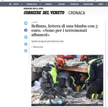 “E dashur Mbrojtja Civile e Bellunos. Unë jam Emily e sot kur u zgjova në mëngjes dëgjova në lajme për lajmin e keq. Mami im që tani është duke pirë kafe, më shpjegoi se në Shqipëri pati një tërmet të fortë. Unë imagjinova ata fëmijë që po flinin në krevatet e tyre të ngrohta, pranë mamit a babit o pranë vëllezërve të tyre, e do jenë trembur shumë. Më vjen keq e uroj të mos dëgjoj më lajme të tilla në televizor. Nga frika, ata fëmijë nuk do të kenë ngrënë as mëngjes. Unë nuk jam shqiptare, por dua t’u them atyre fëmijëve se dëshiroj të jem mikja e tyre e zemrës. Nuk di si t’ia bëj e dua që ju të më ndihmoni t’iu dërgoj fëmijëve të Shqipërisë këtë pikturën time që ata ta shohin se unë i kam menduar e më vjen shumë keq për atë çfarë u ka ndodhur. Shpresoj që të jenë përsëri të qetë e të lumtur me familjet e tyre. Ju përshëndes fëmijë shqiptarë e po ju nis dhe 5 euro, që nesër të hani mëngjes”–thuhet në letrën prekëse të vogëlushes me emrin Emily.