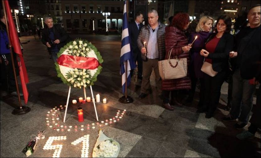 Qytetarë të shumtë u mblodhën në sheshin Kotzia në Athinë ku ndezën qirinj në kujtim të viktimave.
