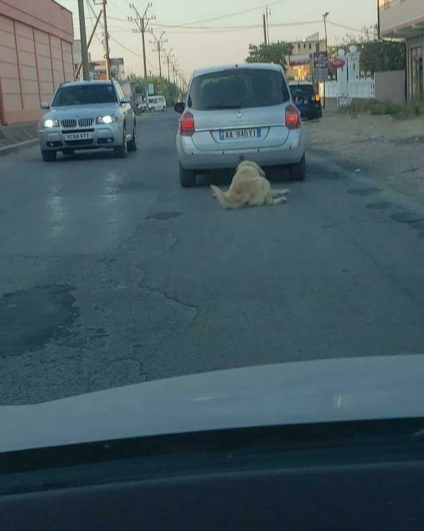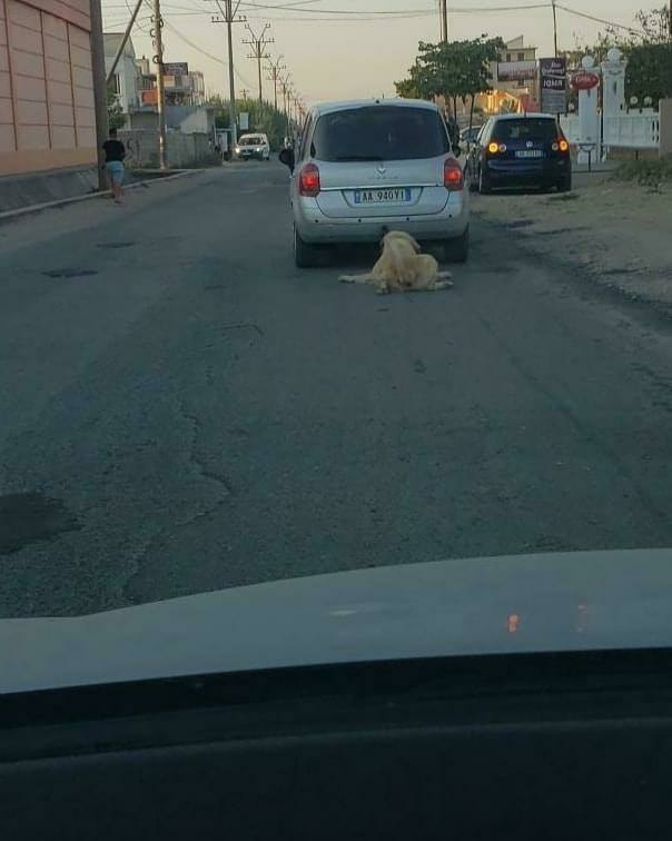 Disa foto të tmerrshme janë publikuar së fundmi ku duket një qen që është lidhur dhe tërhiqet zvarrë nga një makinë në Durrës.