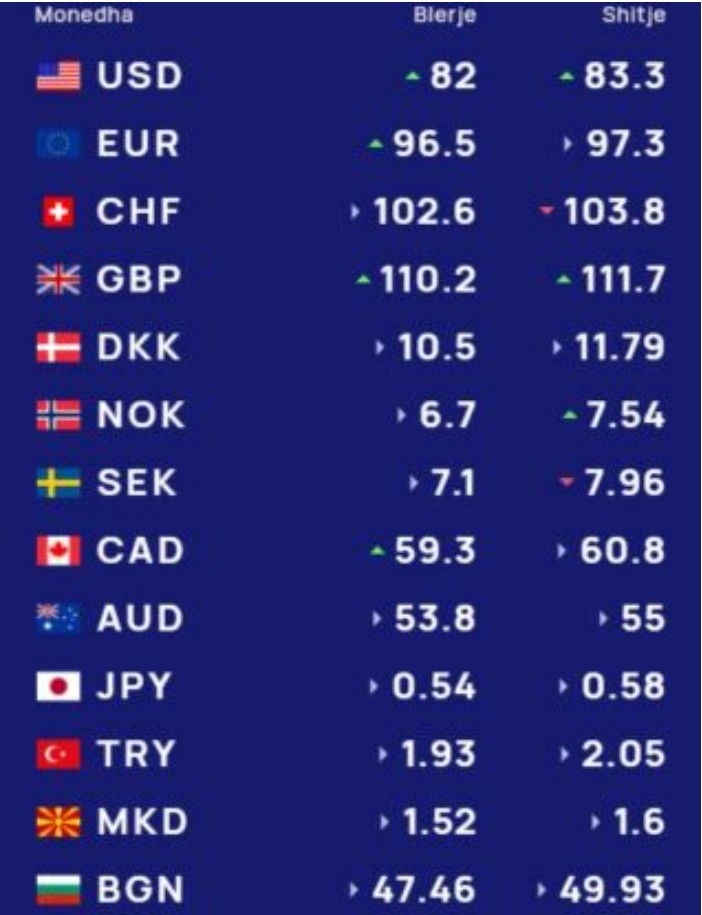 Franga zvicerane blihet me 102.6 lekë dhe shitet me 103.8 lekë, ndërsa paundi britanik blihet me 110.2 lekë dhe shitet me 111.7 lekë.