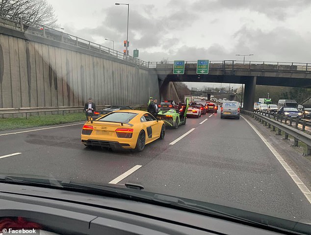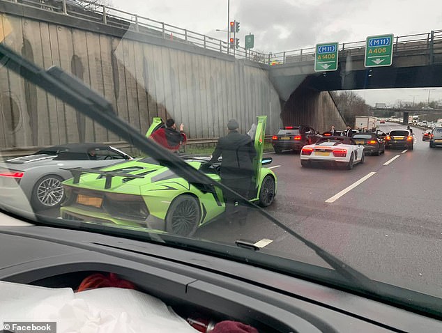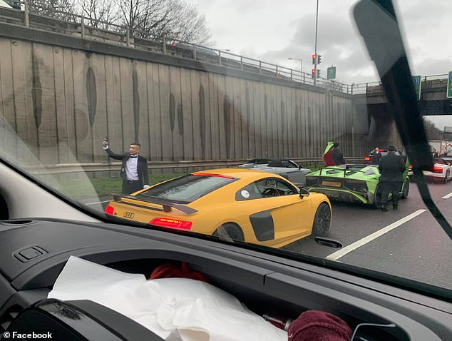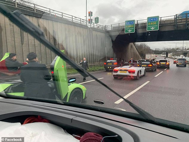 Ky është momenti kur një grup burrash krijuan trafik në një ndalesë në një rrugë të ngjeshur në Londër, në mënyrë që të mund të pozonin një selfie para super makinave të tyre. Të katër burrat u vërejtën duke dalë nga një Lamborghini Aventador dhe tre Audi në Rrugën Qarkore Veriore A406 në lindje të Londrës dje pasdite. Ata u panë në këmbë në mes të trafikut të zënë duke fotografuar veten e tyre me telefonat e tyre.