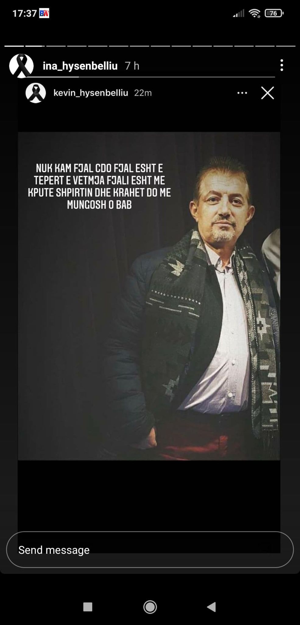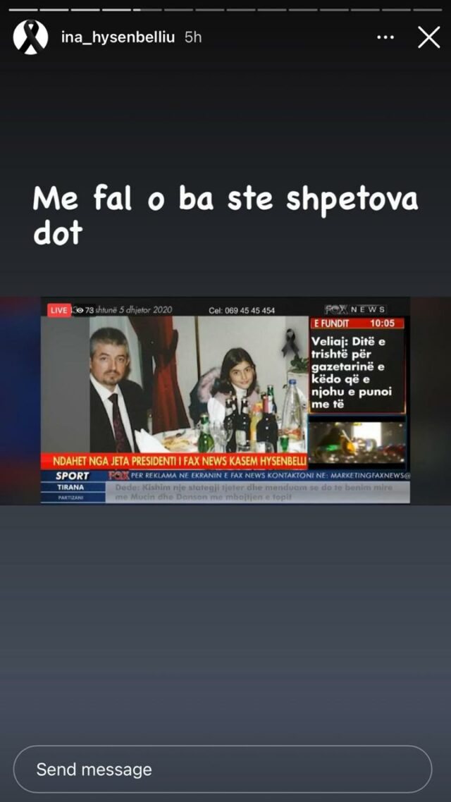 “Më fal baba që stë shpëtova dot. Ma këpute shpirtin o ba. Zemra ime që ua hape derën të gjitheve. Ah shpirti im që më le vetëm. Ishe me i miri prej nesh”, është mesazhi i të bijë së Kasemit.