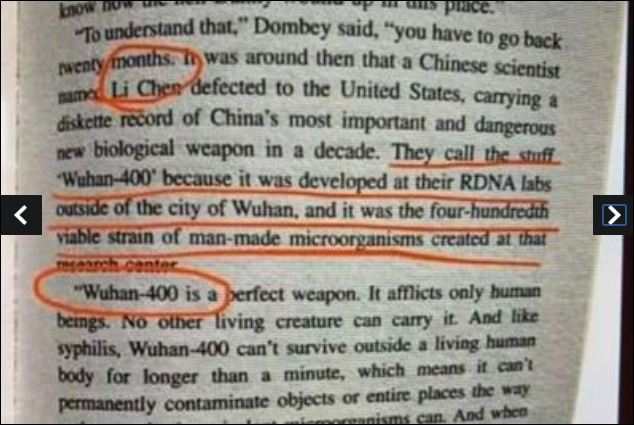 Në tekst thuhet: “Një shkencëtar kinez me emrin Li Chen u largua në Shtetet e Bashkuara, duke mbajtur një kopje në disk të armës biologjike më të rëndësishme dhe të rrezikshme kineze të dekadës. Ata e quajnë ‘Uuhan-400’ sepse ishte zhvilluar në laboratorët e tyre. RDNA afër qytetit të Ëuhan dhe ishte lloji i 400-të i zbatueshëm i mikroorganizmave të krijuar në atë qendër kërkimore “. “Uuhan-400 është një armë e përsosur”, thotë shkrimtari, sepse “prek vetëm njerëzit”. Kjo nuk është gjithçka, sepse në një pasazh tjetër të të njëjtit roman Koonts shkruhet se “rreth vitit 2020 një pneumoni serioze do të përhapet në të gjithë botën” dhe se kjo është “në gjendje t’i rezistojë të gjitha trajtimeve të njohura”.